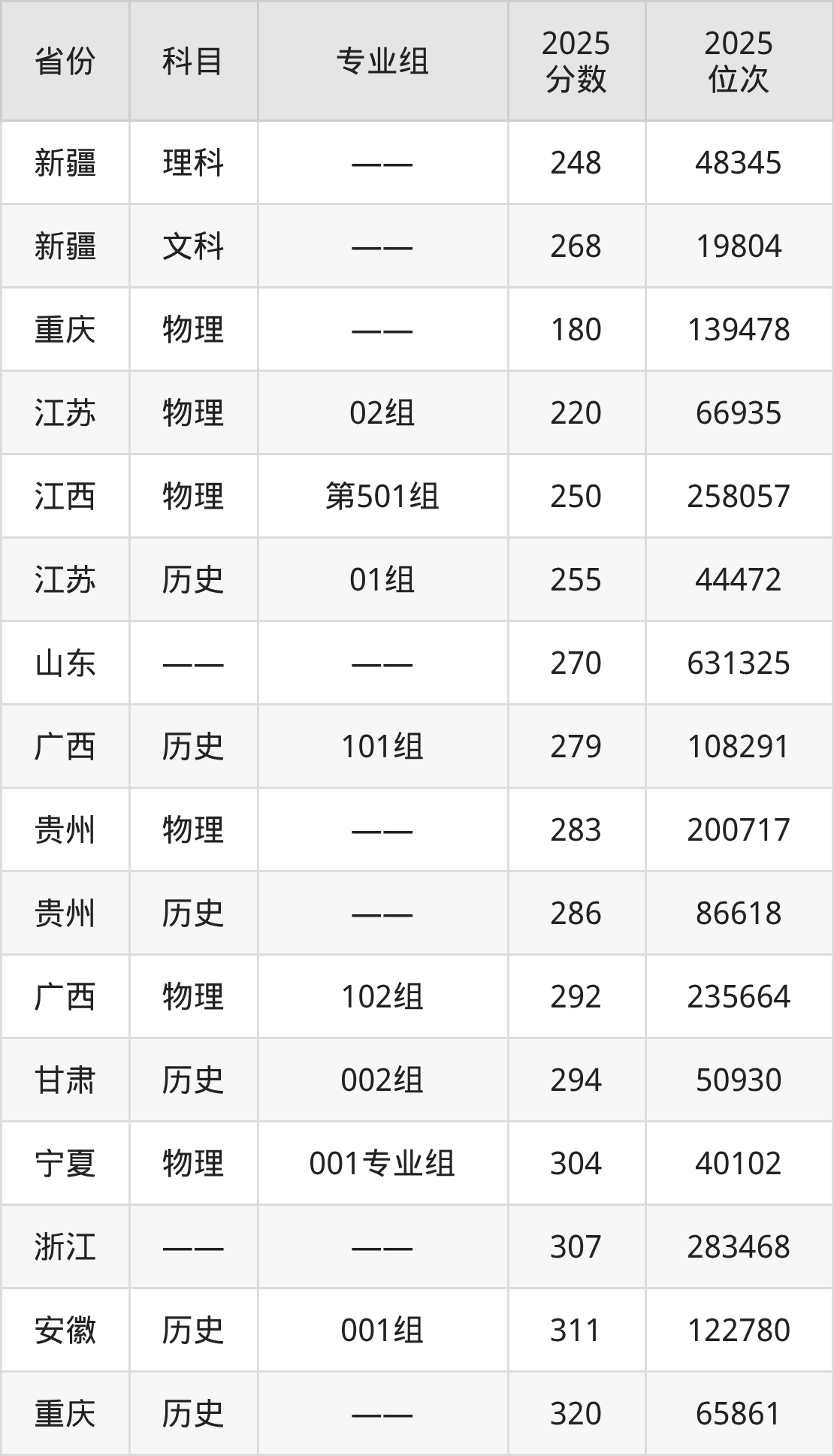 物理类:2025年塔里木职业技术学院录取最低分是180分(重庆),对应的位次排名是139478名。