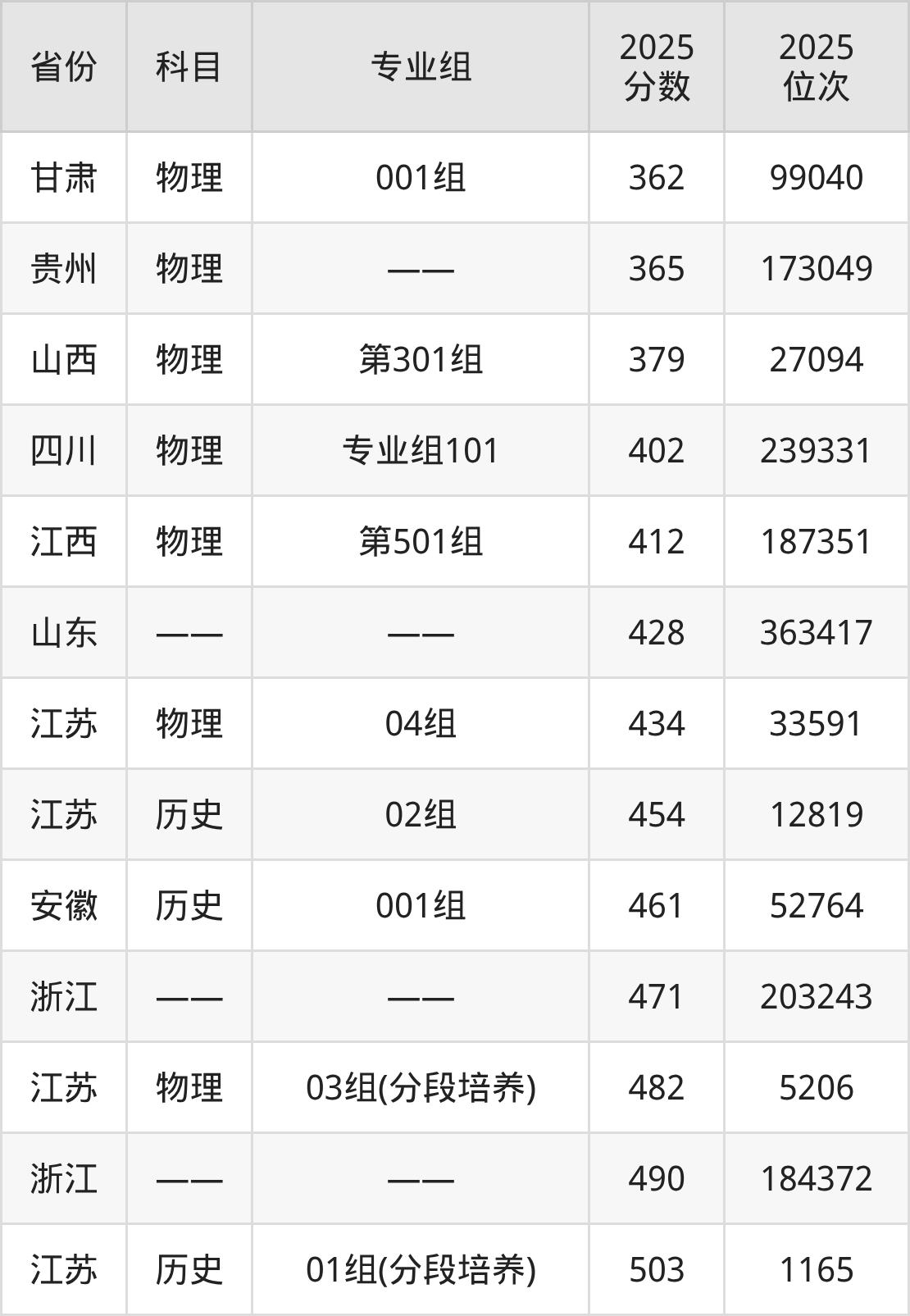 物理类:2025年南京交通职业技术学院录取最低分是362分(甘肃),对应的位次排名是99040名。