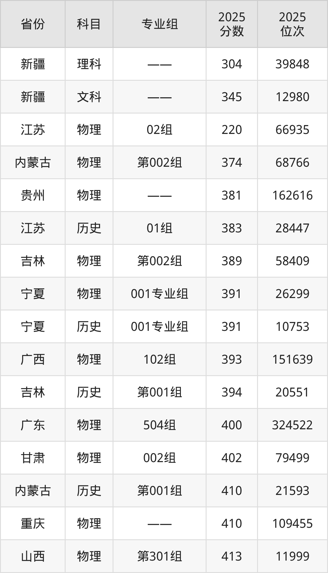 物理类:2025年江苏农牧科技职业学院录取最低分是374分(内蒙古),对应的位次排名是68766名。