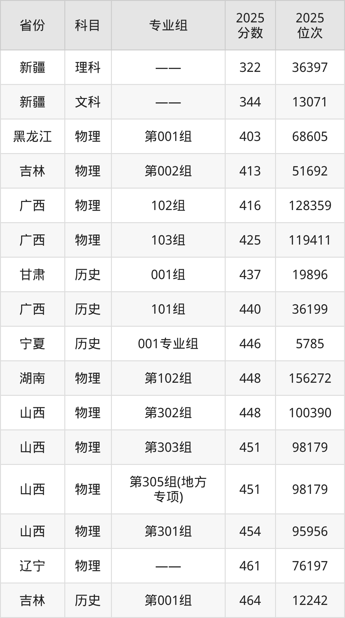 2025年运城学院全国排名第441位,2025年录取分数线最低322分(位次36397)。本文将展示运城学院在各省最低录取分数线汇总,供2026届想要报考该校的考生查阅。