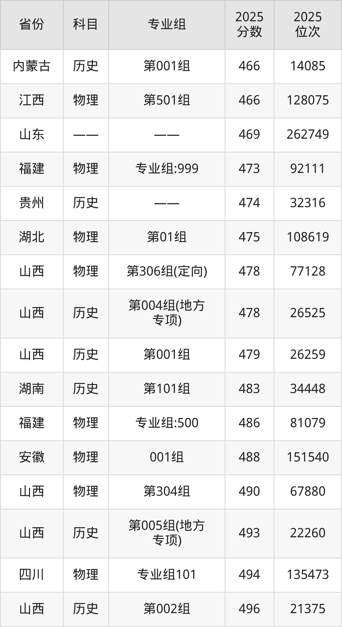 3+3地区:2025年运城学院录取最低分是469分(山东),对应的位次排名是262749名。