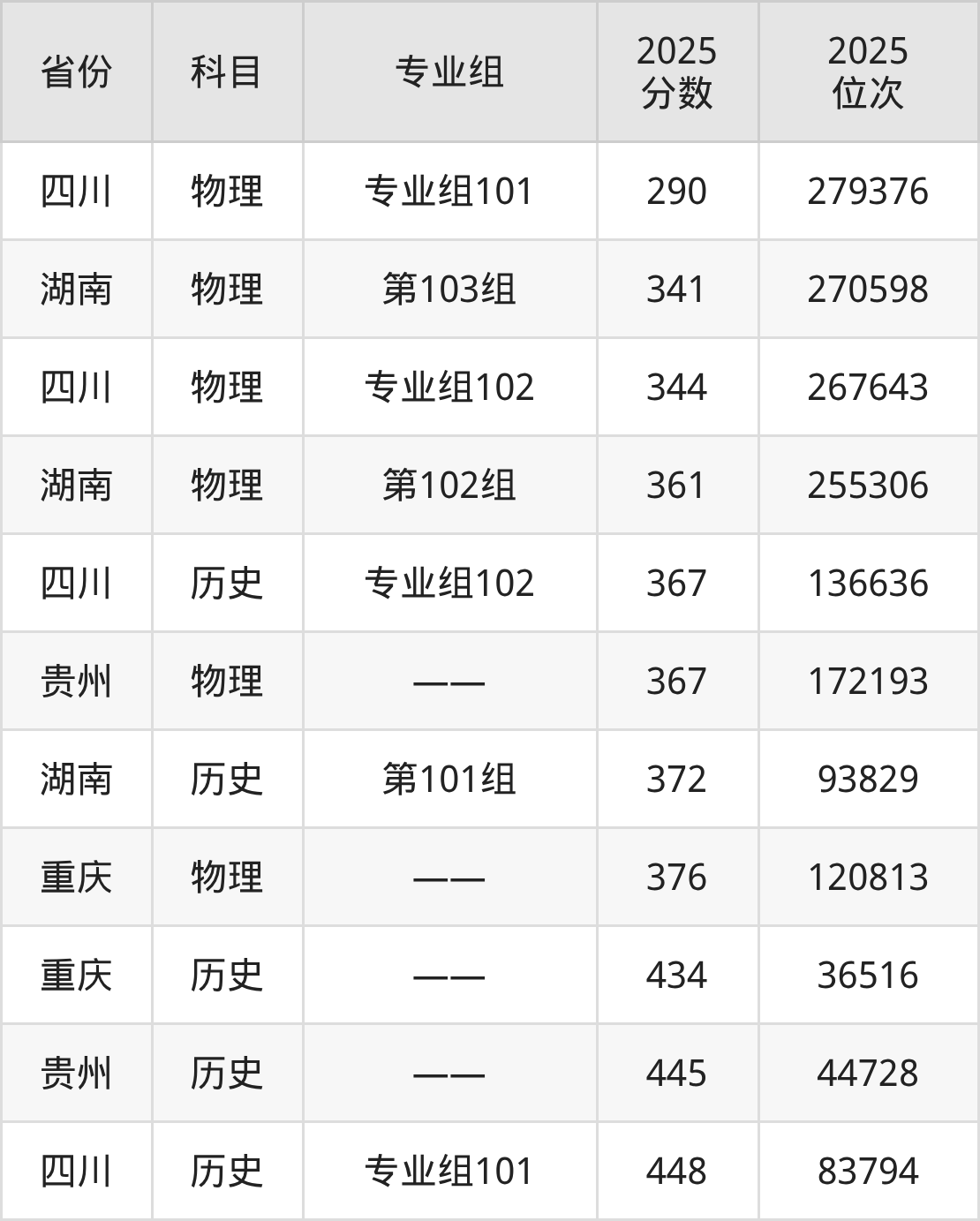 物理类:2025年达州职业技术学院录取最低分是341分(湖南),对应的位次排名是270598名。
