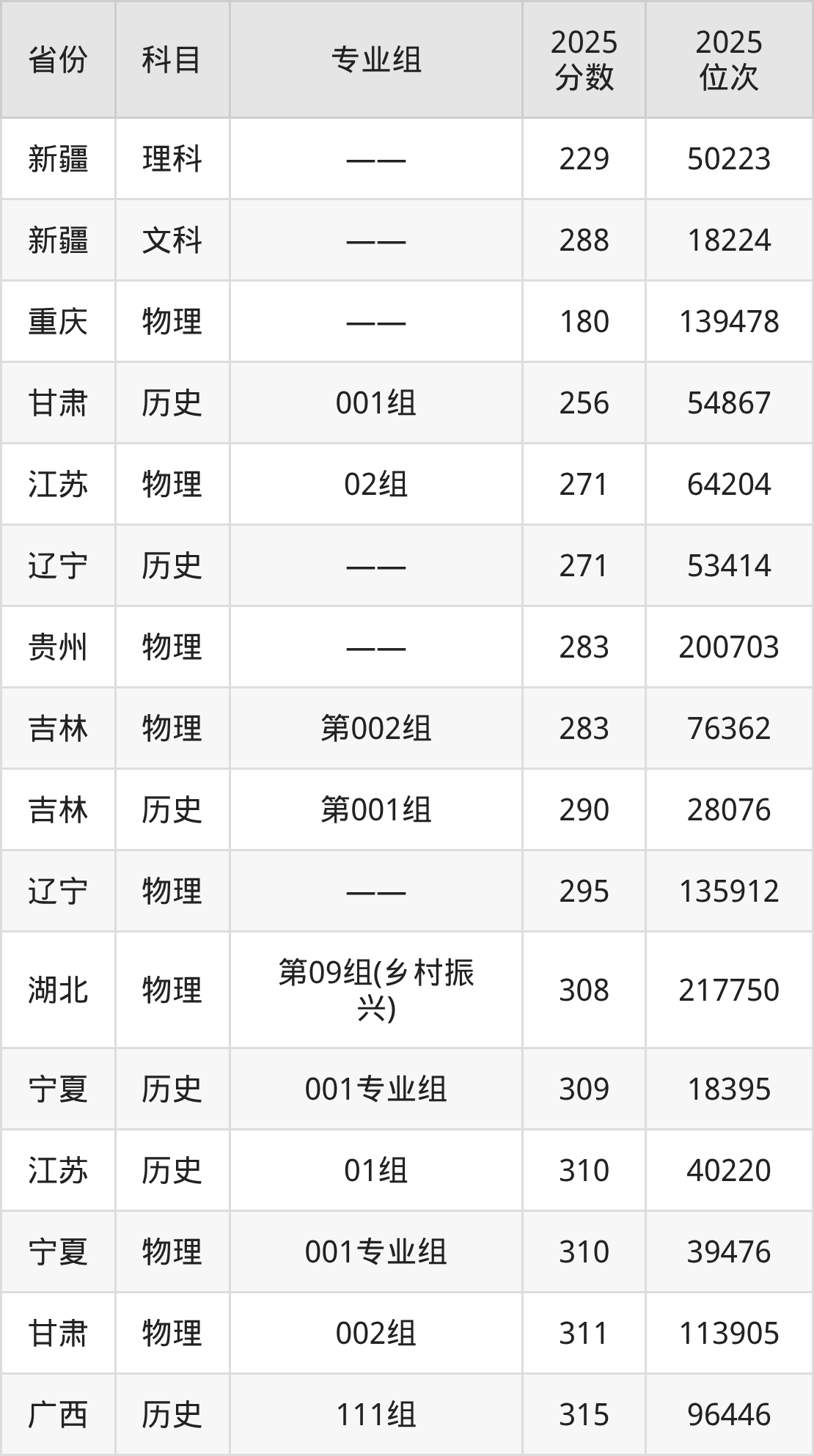 文科:2025年咸宁职业技术学院录取最低分是288分(新疆),对应的位次排名是18224名。