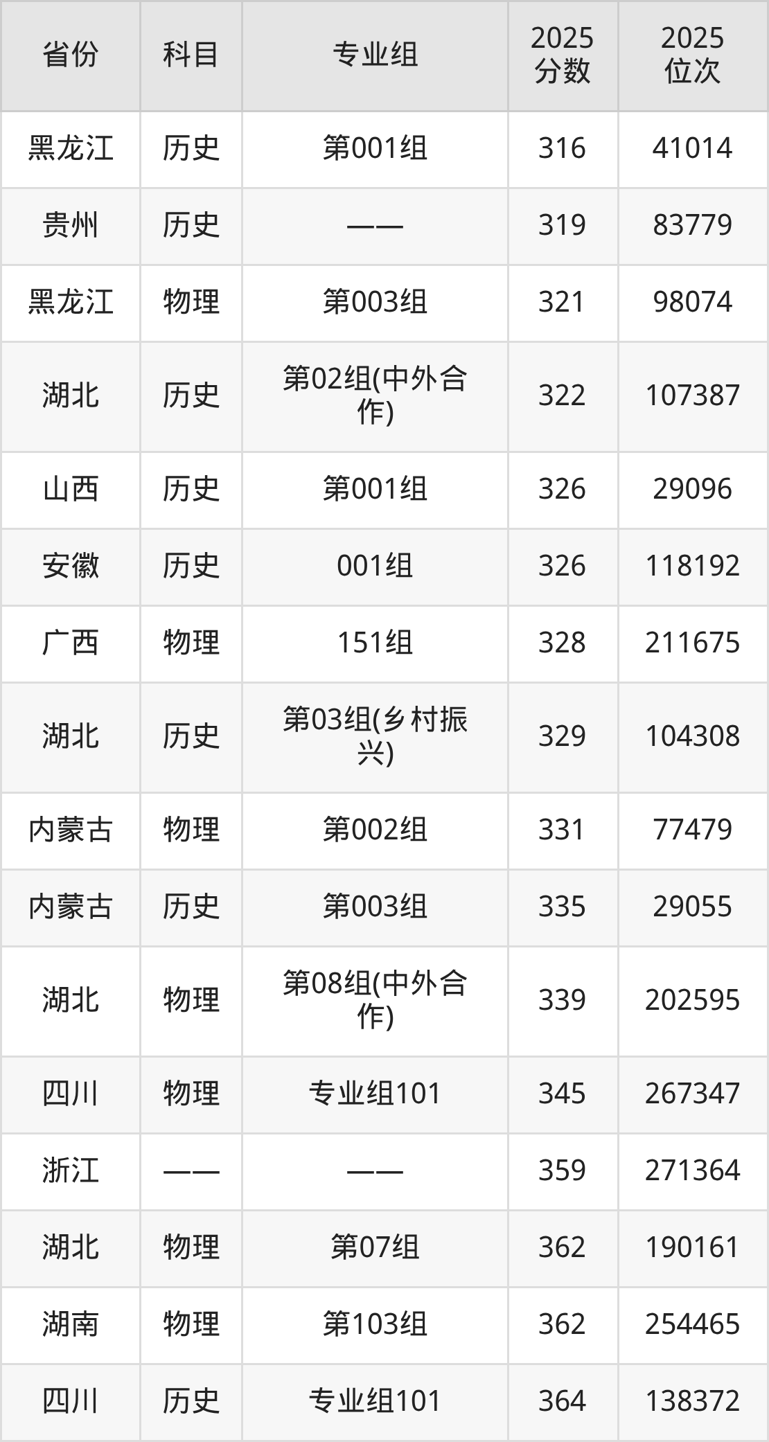 3+3地区:2025年咸宁职业技术学院录取最低分是359分(浙江),对应的位次排名是271364名。