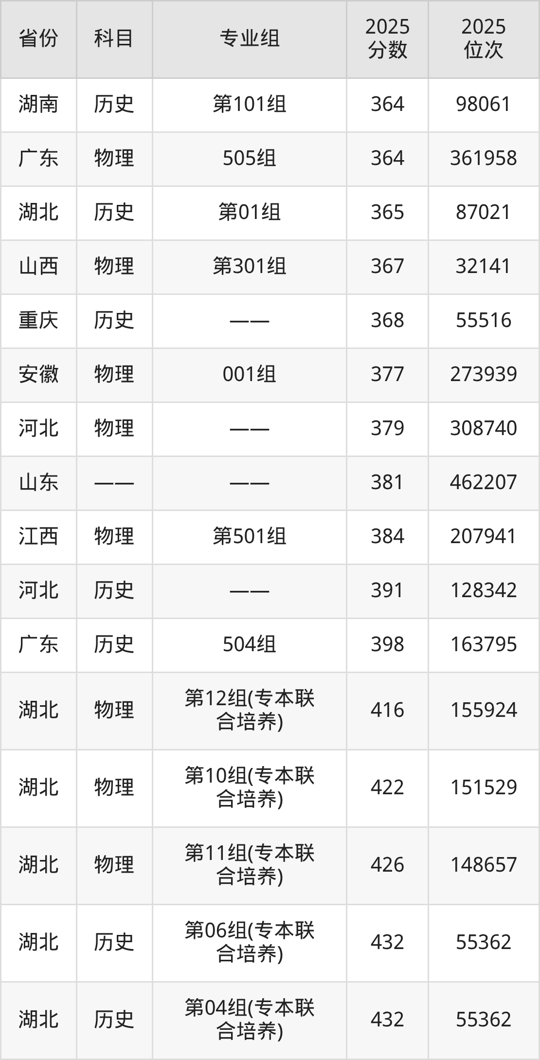 历史类:2025年咸宁职业技术学院省内录取最低分是322分,对应的位次排名是107387名。建议:如果2026年排名超过107387名,那么被该校录取的概率较大。
