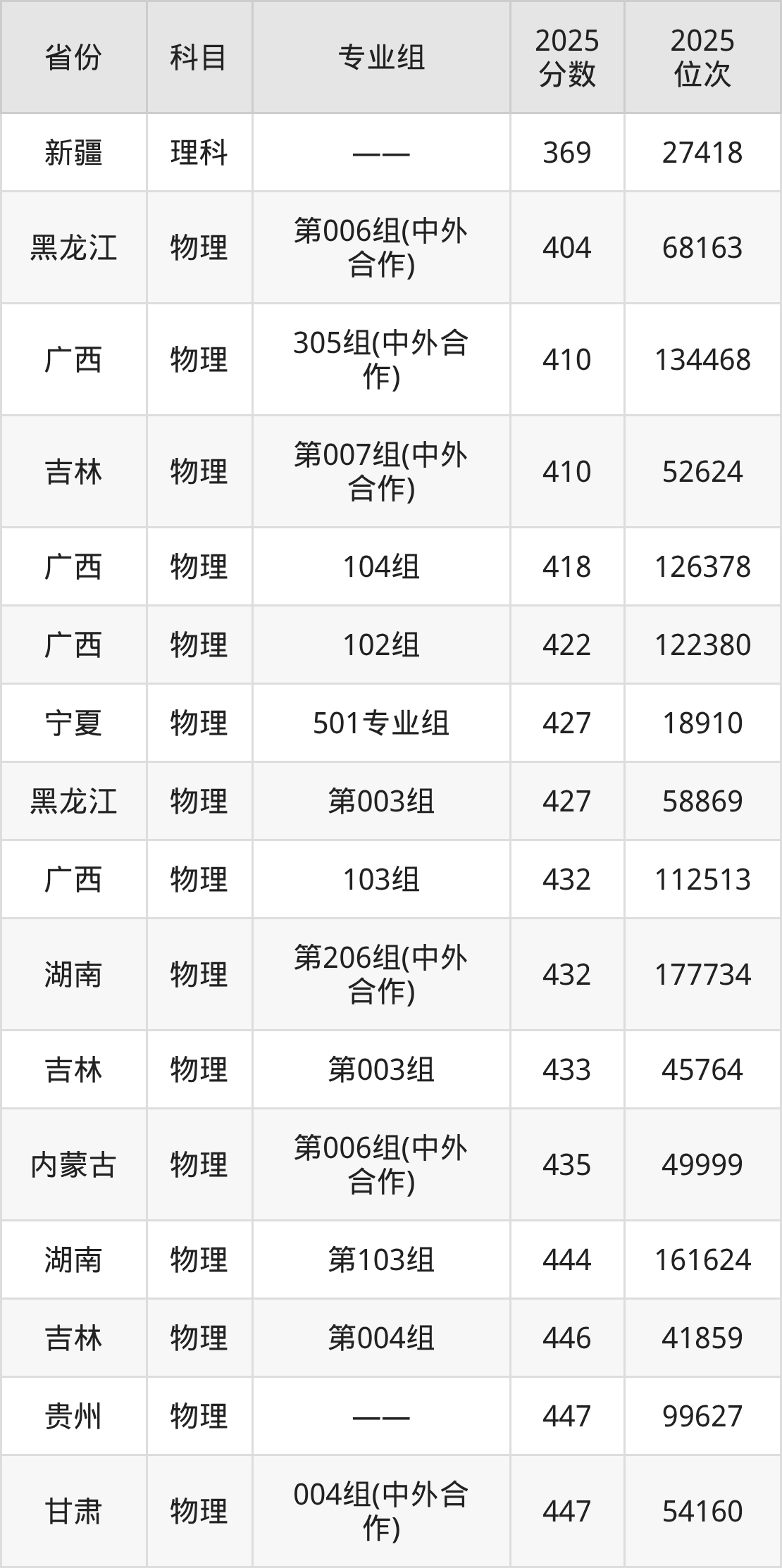 物理类:2025年吉林医药学院录取最低分是404分(黑龙江),对应的位次排名是68163名。