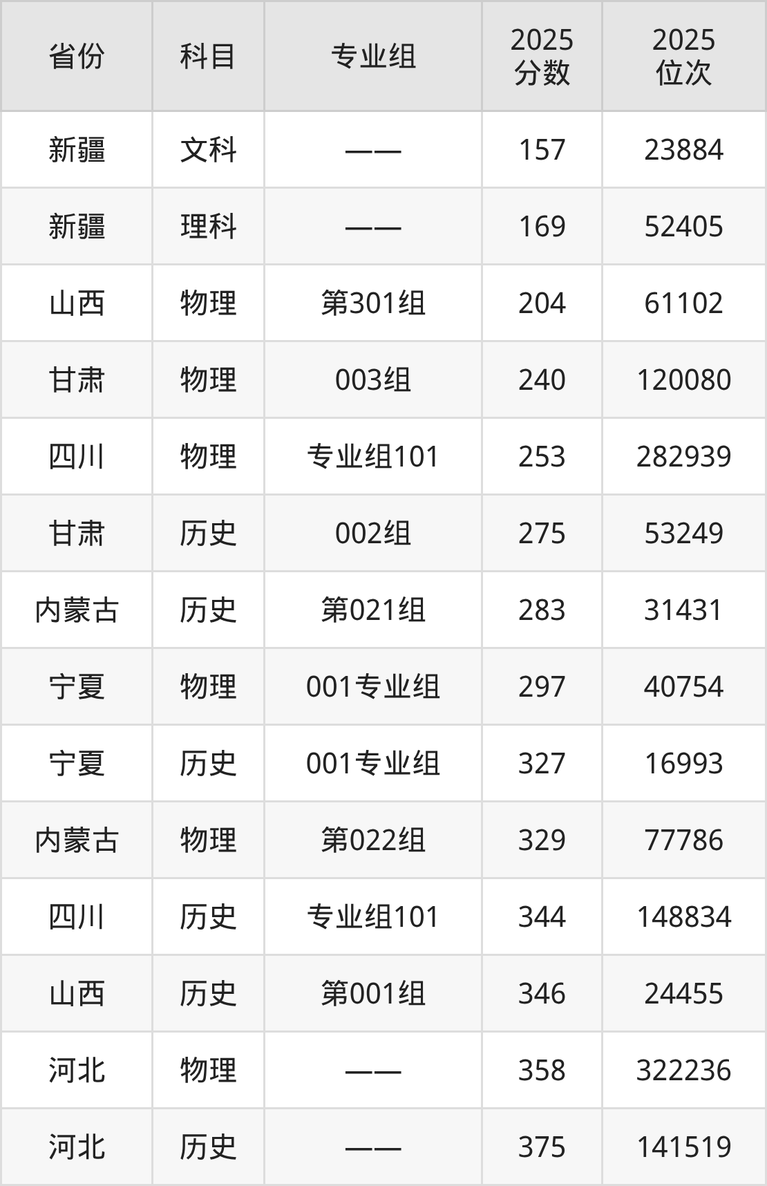 理科:2025年平凉职业技术学院录取最低分是169分(新疆),对应的位次排名是52405名。