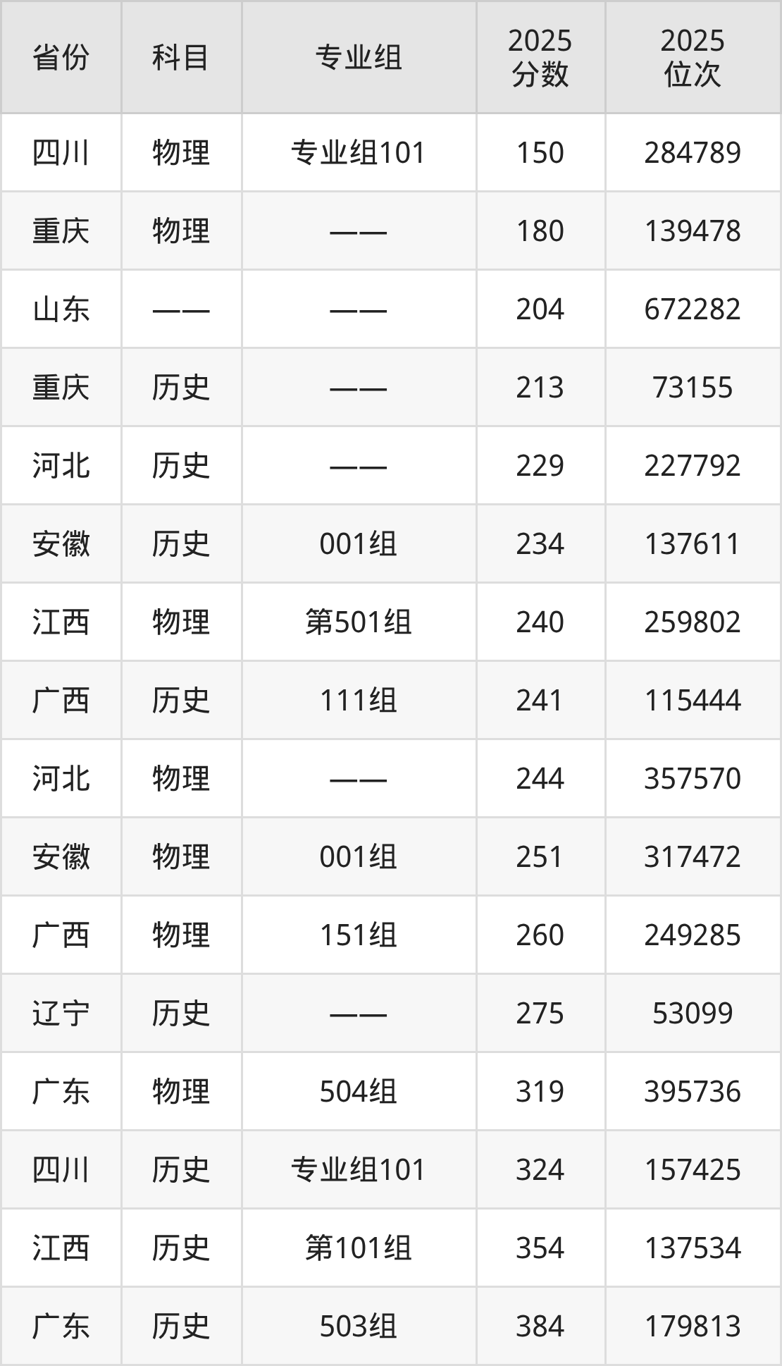 历史类:2025年北海康养职业学院录取最低分是213分(重庆),对应的位次排名是73155名。