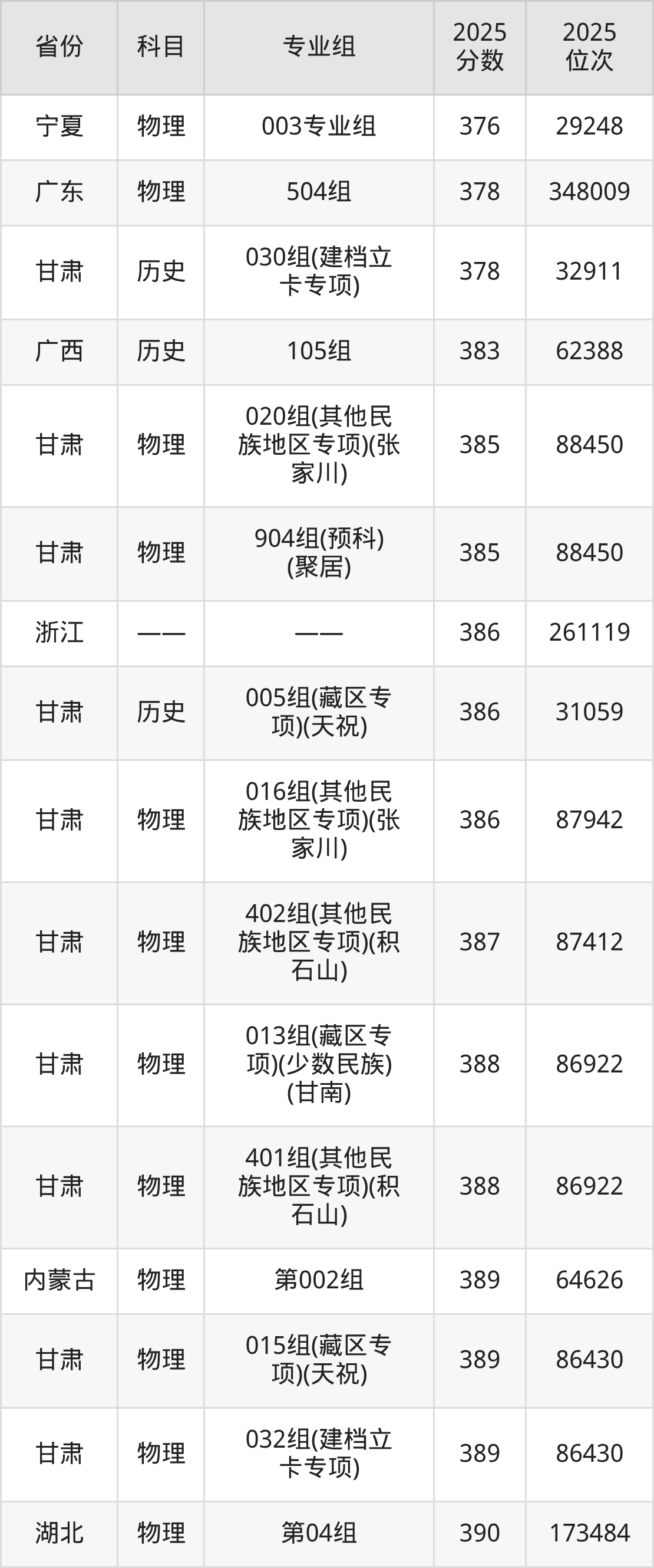 3+3地区:2025年兰州石化职业技术大学录取最低分是386分(浙江),对应的位次排名是261119名。