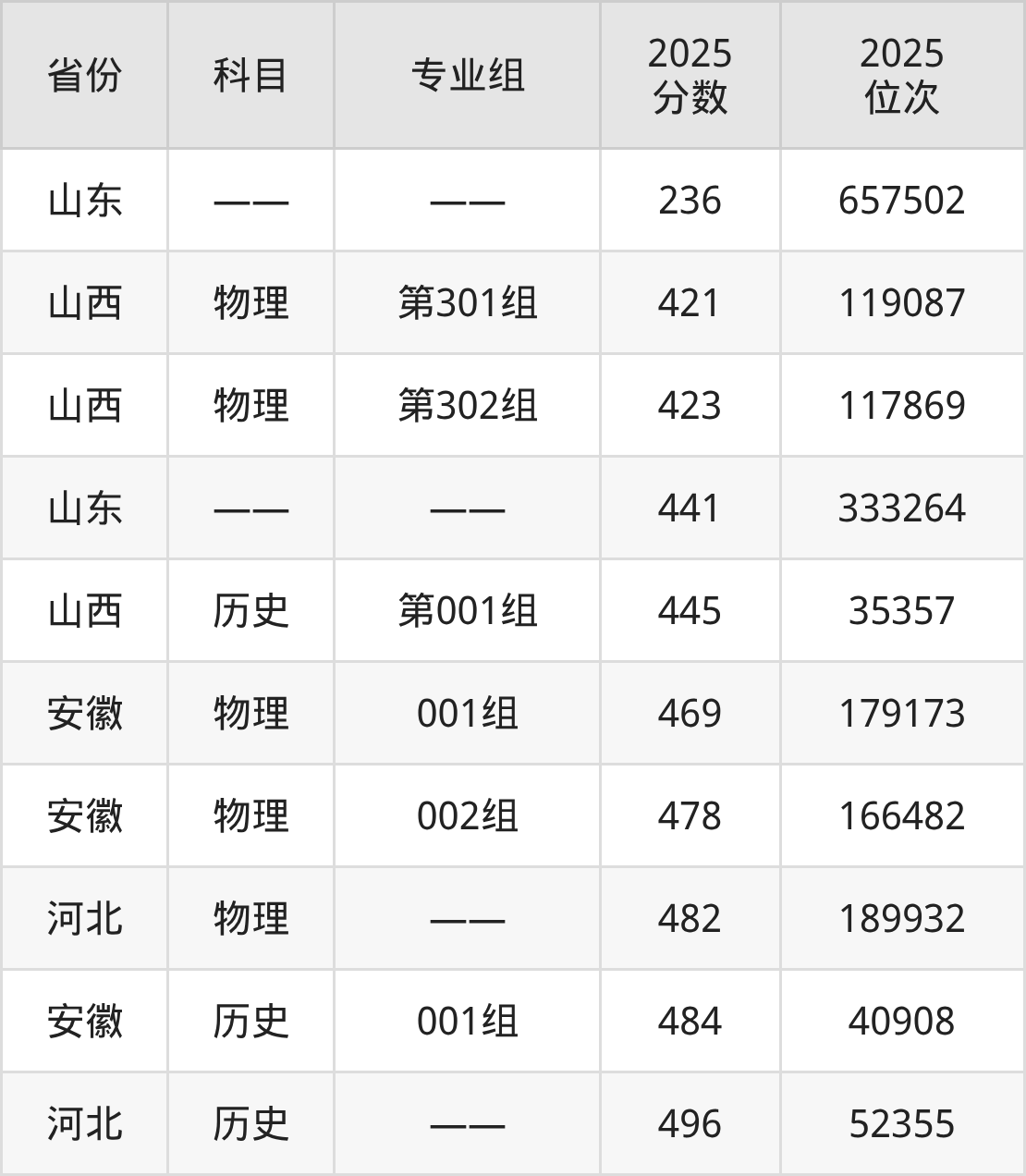 物理类:2025年山东华宇工学院录取最低分是421分(山西),对应的位次排名是119087名。