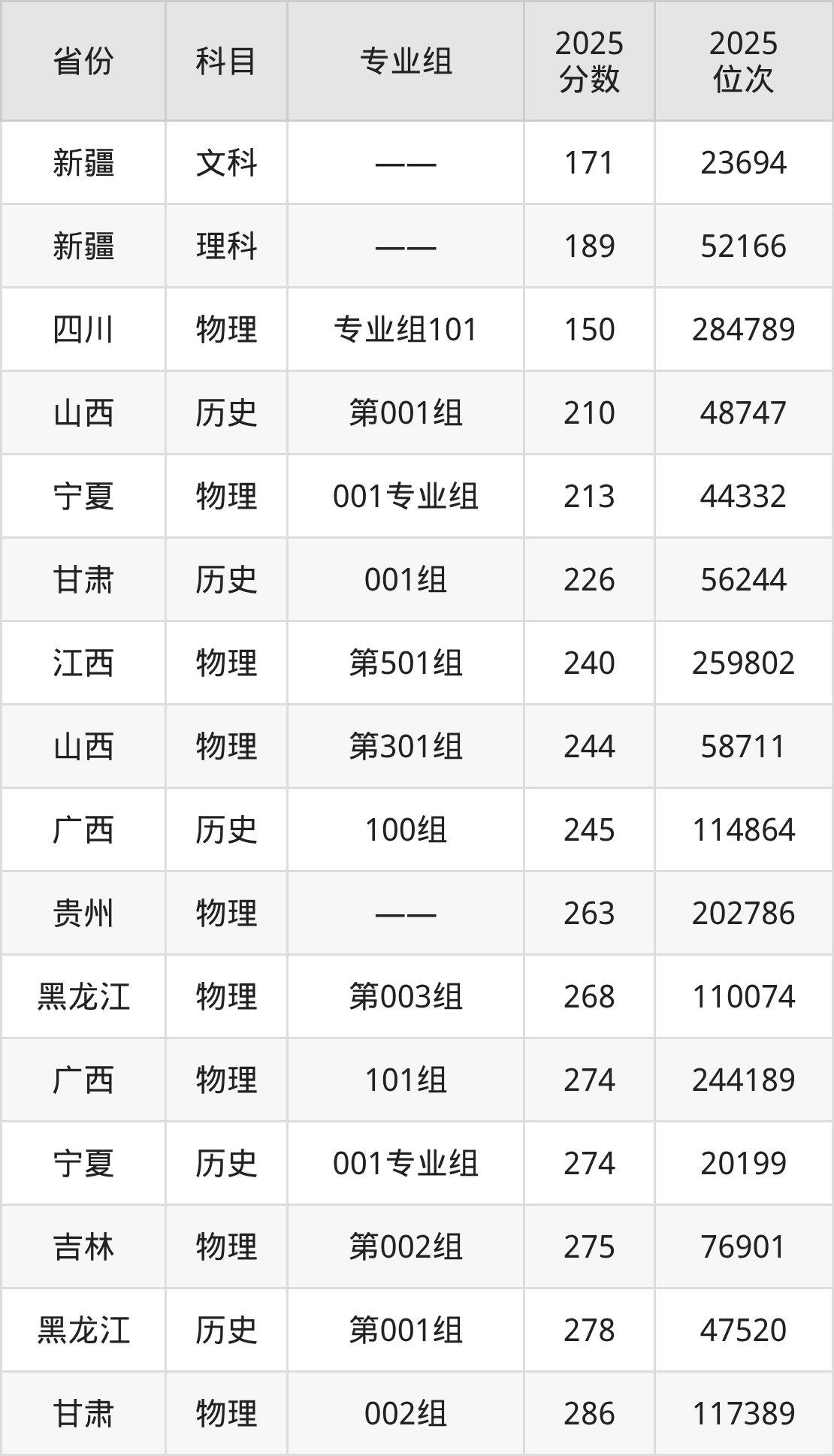 物理类:2025年黑龙江农业经济职业学院录取最低分是150分(四川),对应的位次排名是284789名。