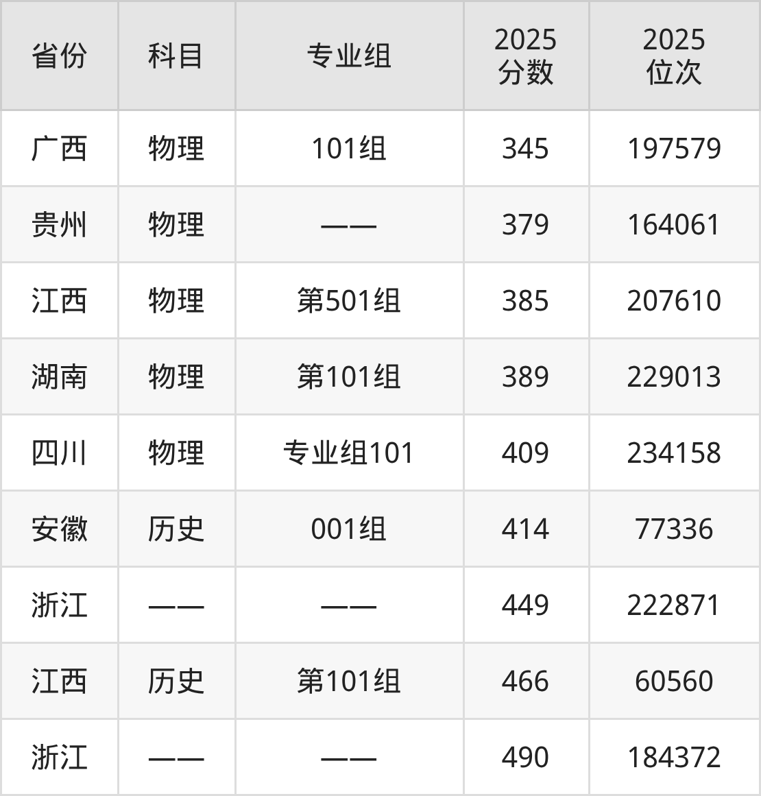 物理类:2025年衢州职业技术学院录取最低分是345分(广西),对应的位次排名是197579名。