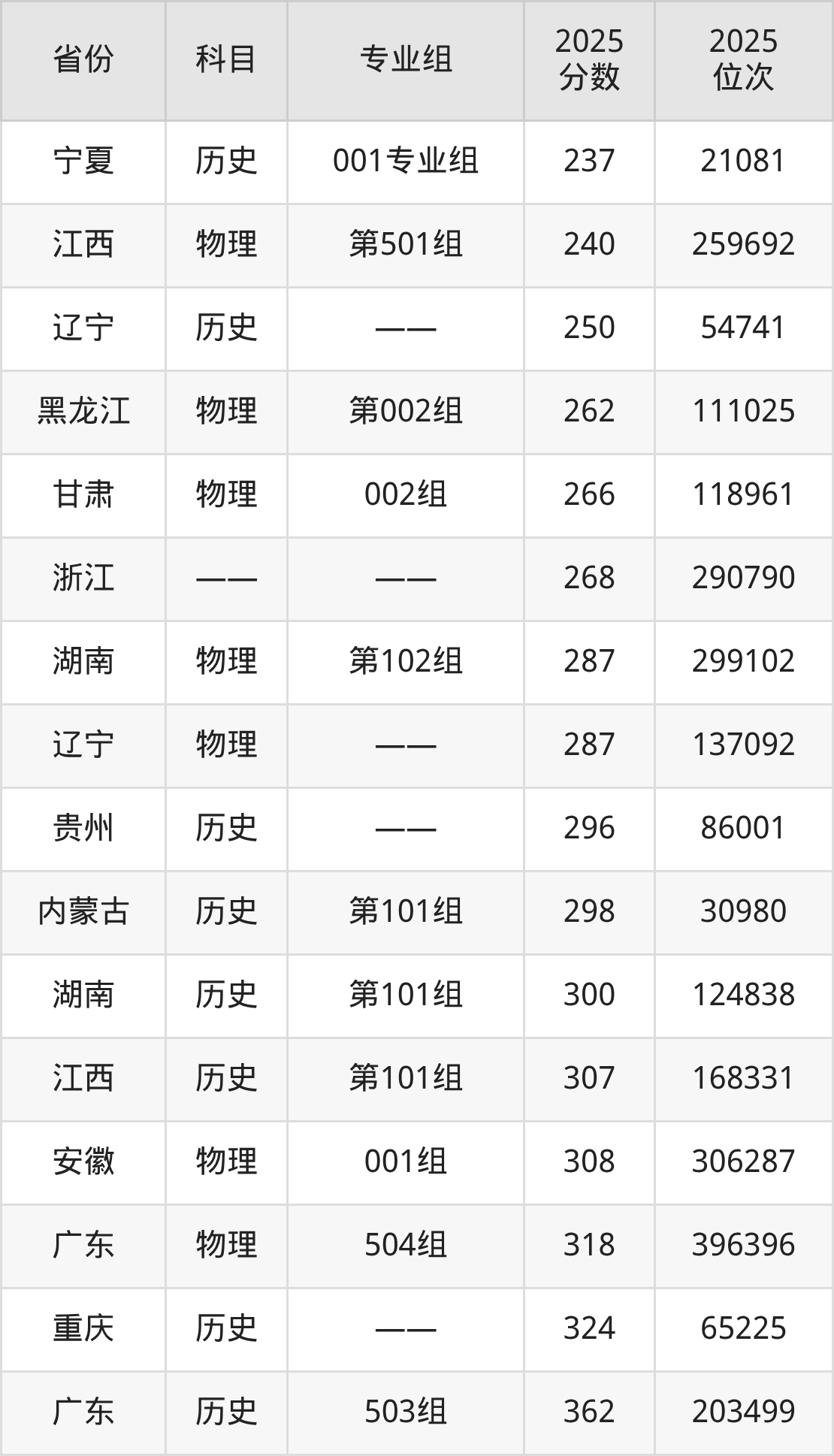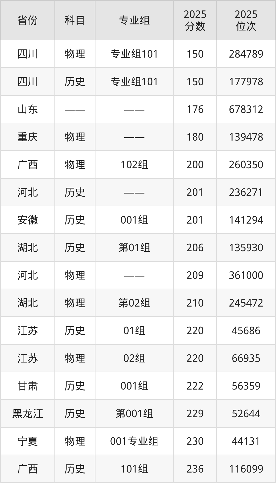 历史类:2025年资阳环境科技职业学院省内录取最低分是150分,对应的位次排名是177978名。建议:如果2026年排名超过177978名,那么被该校录取的概率较大。