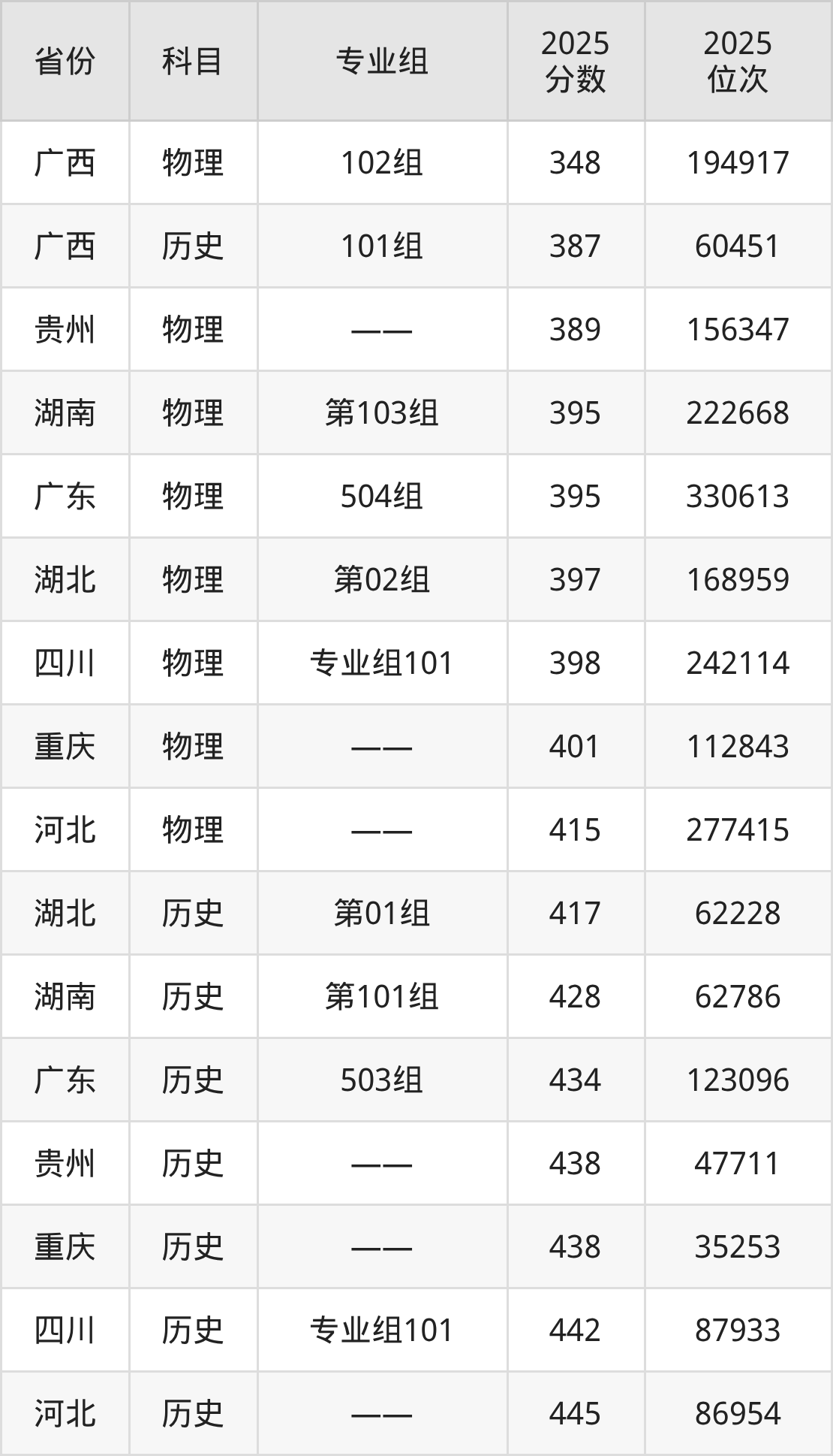 物理类:2025年湖南司法警官职业学院录取最低分是348分(广西),对应的位次排名是194917名。