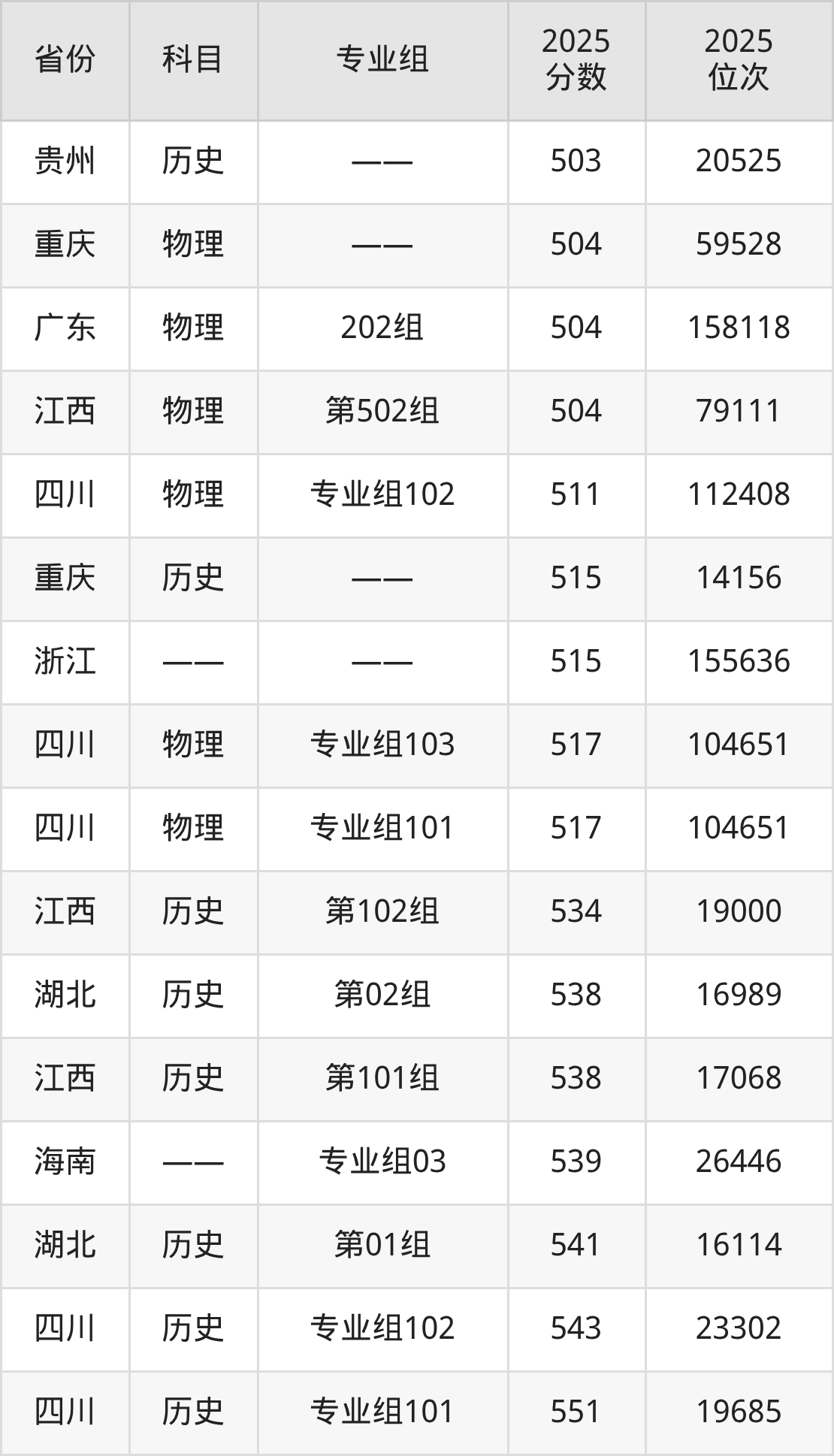 历史类:2025年贵阳学院省内录取最低分是503分,对应的位次排名是20525名。建议:如果2026年排名超过20525名,那么被该校录取的概率较大。