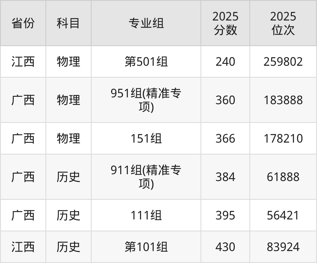 物理类:2025年广西职业技术学院录取最低分是240分(江西),对应的位次排名是259802名。