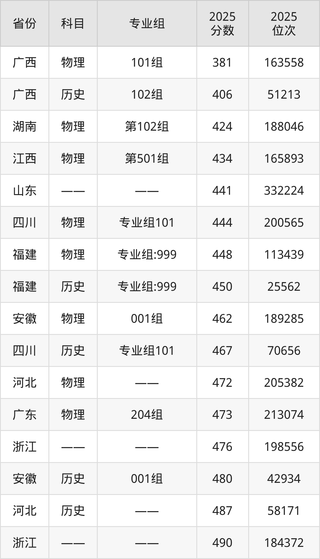 物理类:2025年泉州职业技术大学录取最低分是381分(广西),对应的位次排名是163558名。
