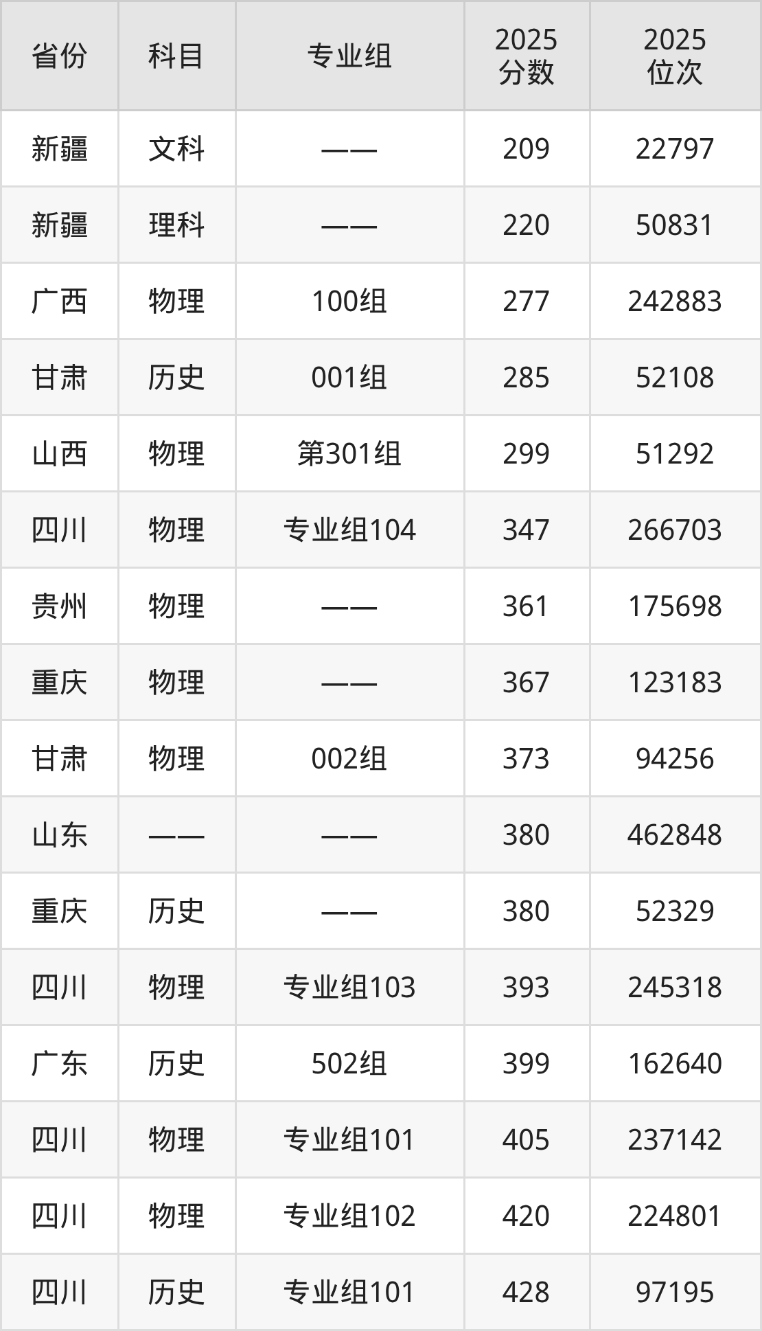 3+3地区:2025年四川工商职业技术学院录取最低分是380分(山东),对应的位次排名是462848名。
