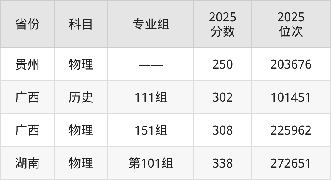 物理类:2025年广西智能制造职业技术学院录取最低分是250分(贵州),对应的位次排名是203676名。