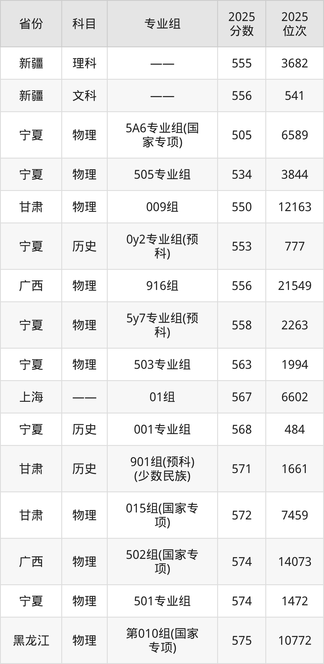 文科:2025年山东大学录取最低分是556分(新疆),对应的位次排名是541名。