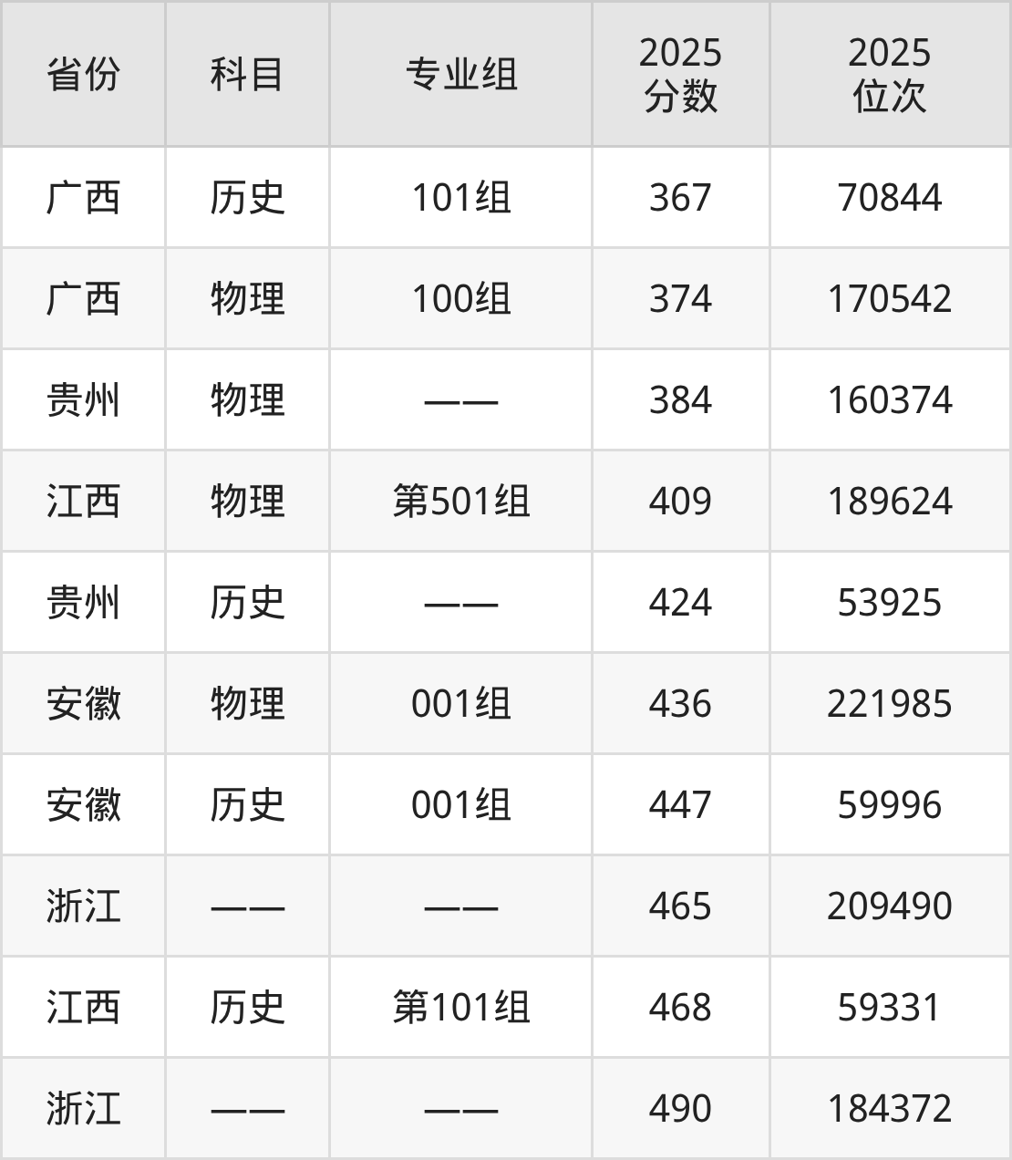 物理类:2025年浙江工业职业技术学院录取最低分是374分(广西),对应的位次排名是170542名。