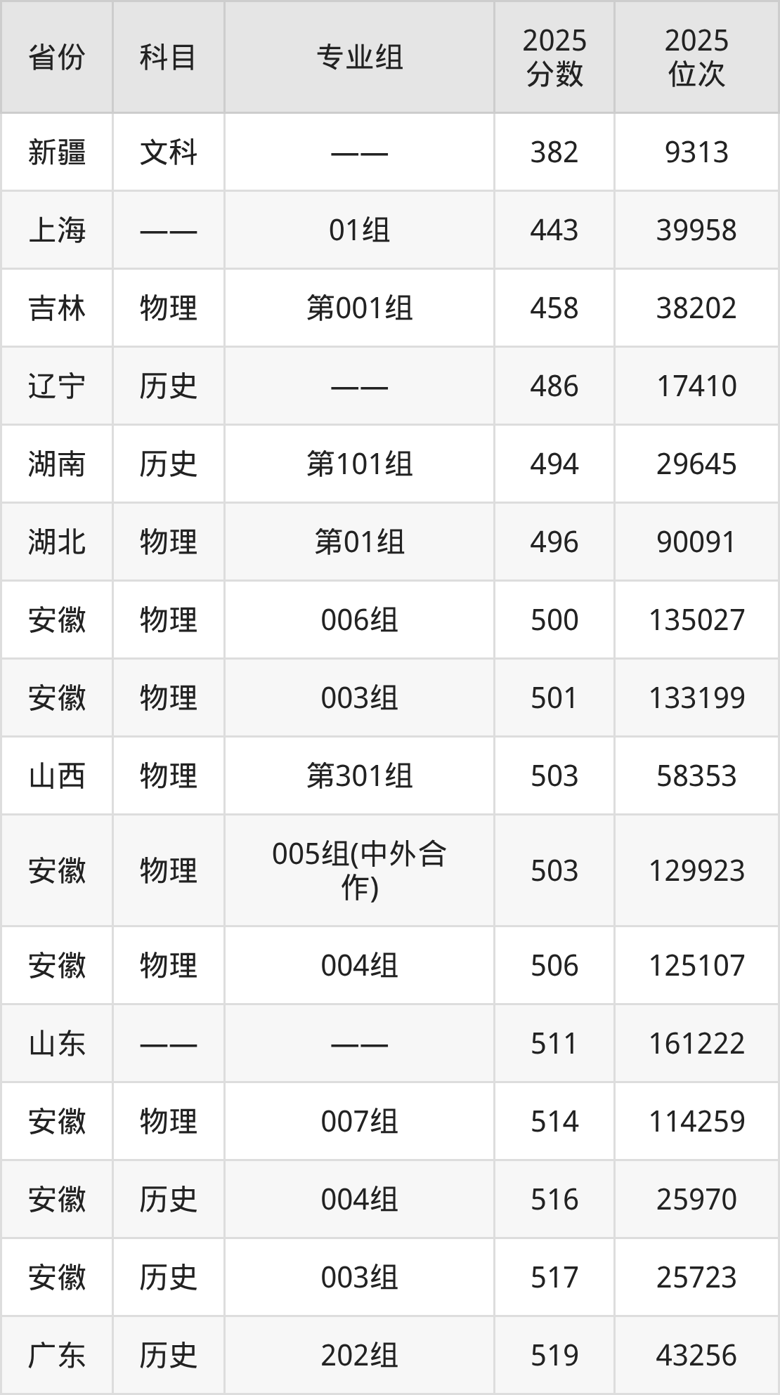 文科:2025年滁州学院录取最低分是382分(新疆),对应的位次排名是9313名。