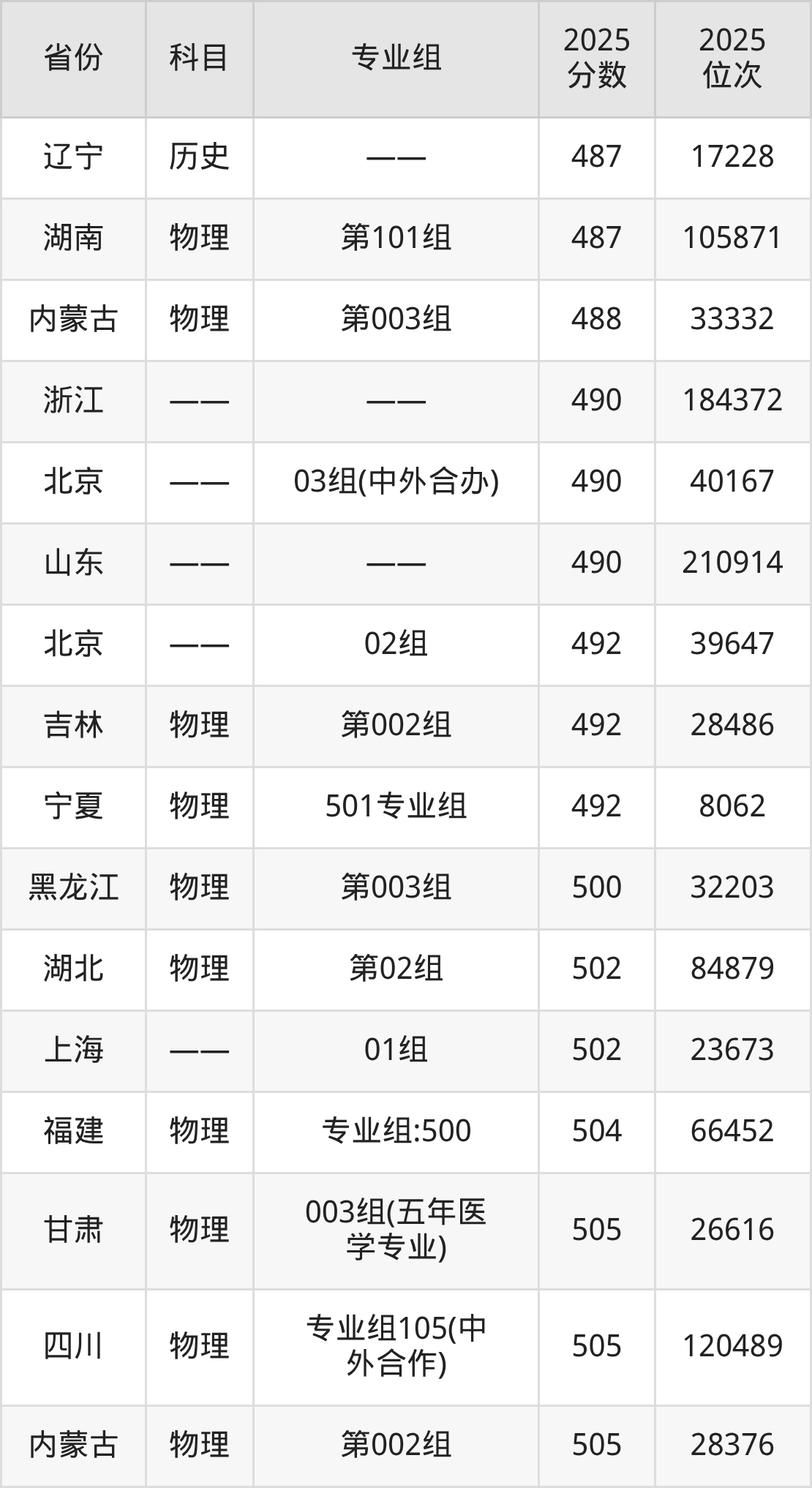 历史类:2025年锦州医科大学省内录取最低分是487分,对应的位次排名是17228名。建议:如果2026年排名超过17228名,那么被该校录取的概率较大。