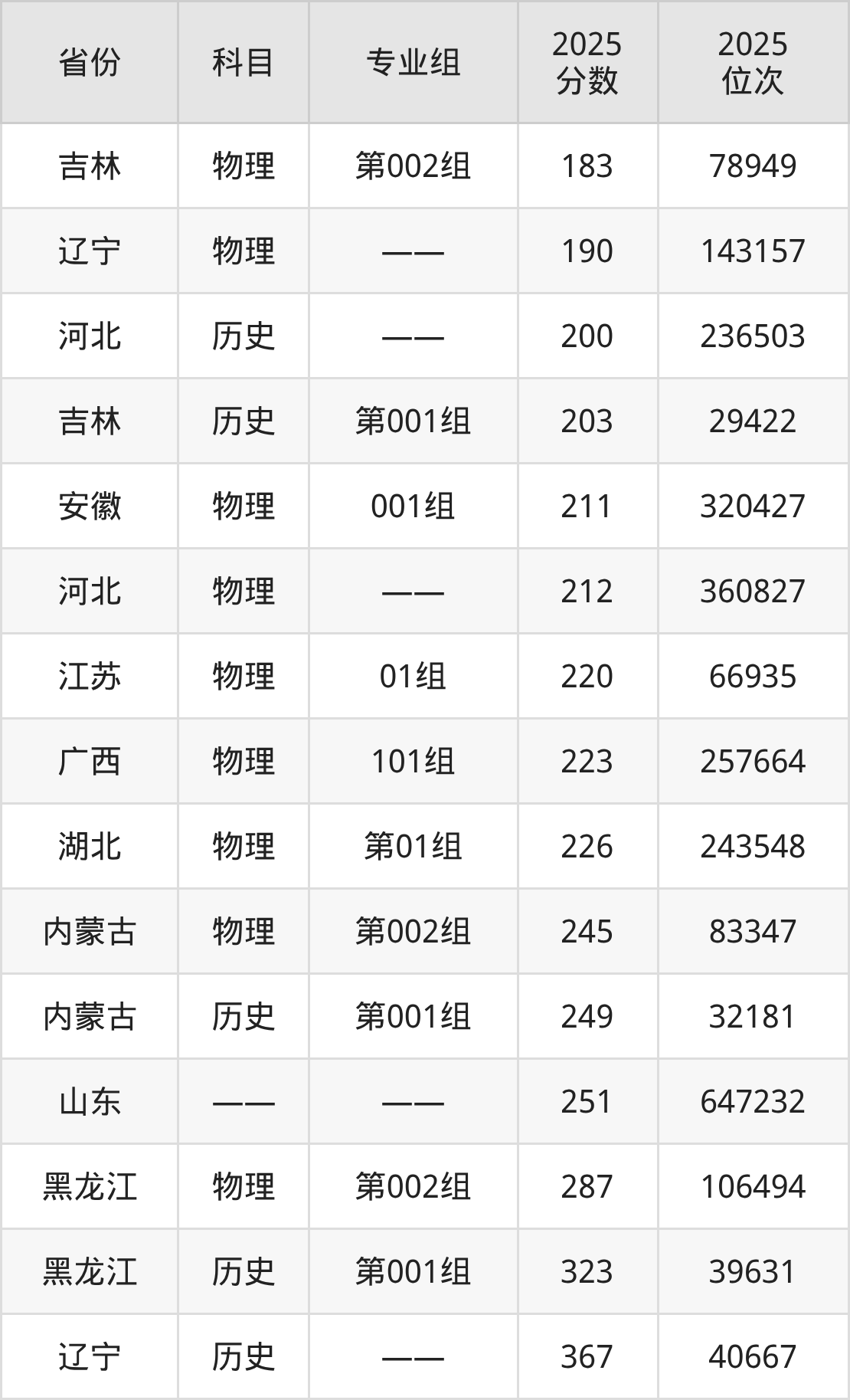 物理类:2025年长春东方职业学院录取最低分是190分(辽宁),对应的位次排名是143157名。