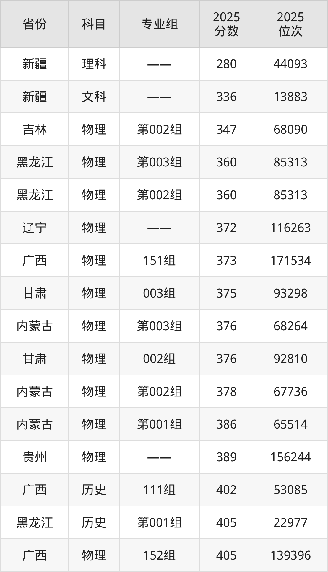 理科:2025年哈尔滨剑桥学院录取最低分是280分(新疆),对应的位次排名是44093名。