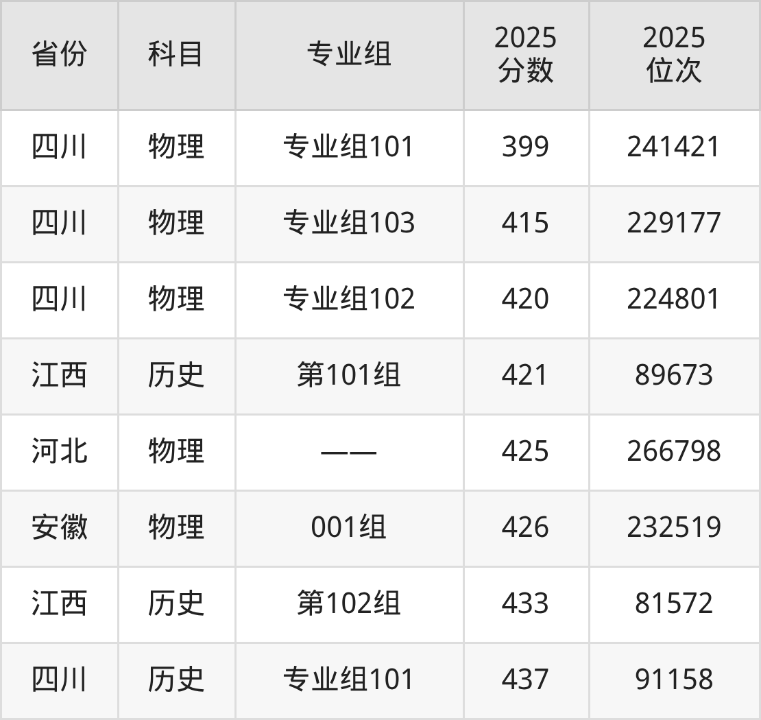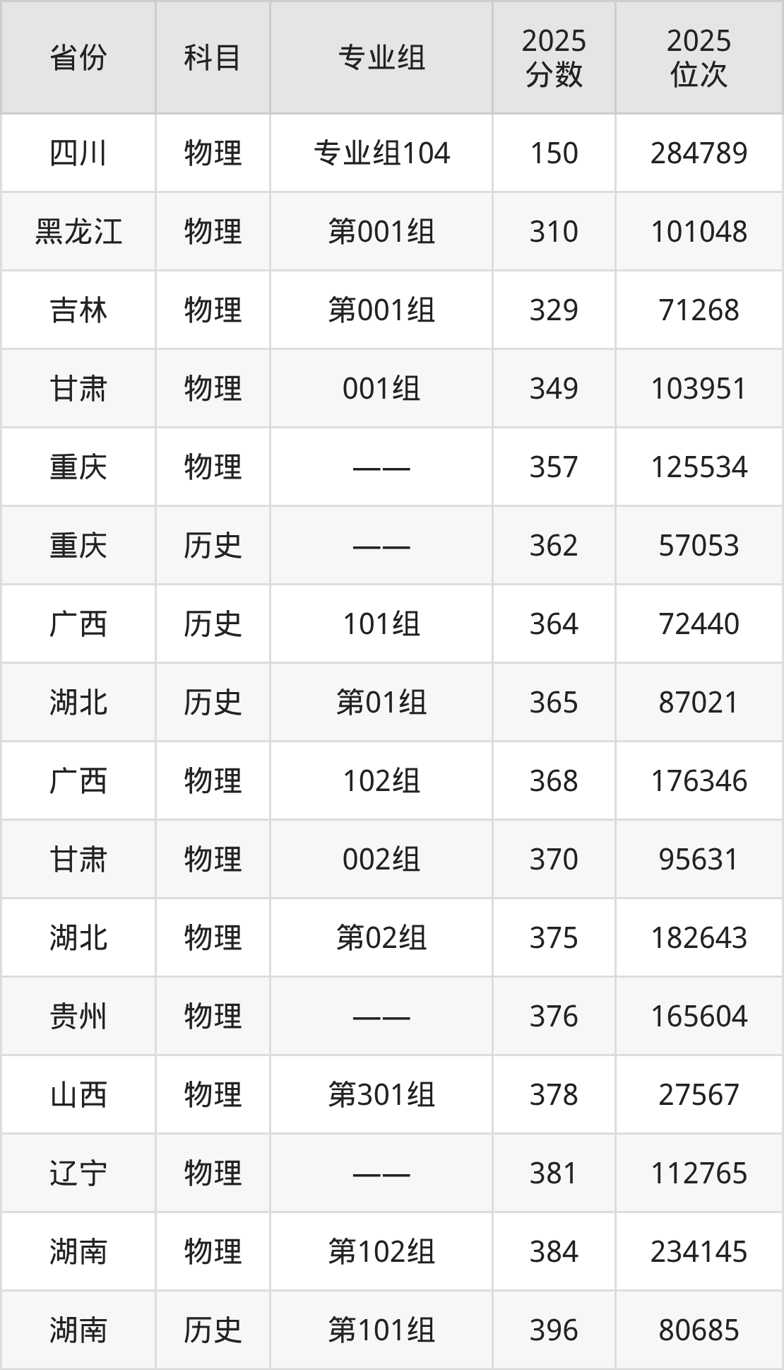 物理类:2025年宜宾职业技术学院录取最低分是310分(黑龙江),对应的位次排名是101048名。