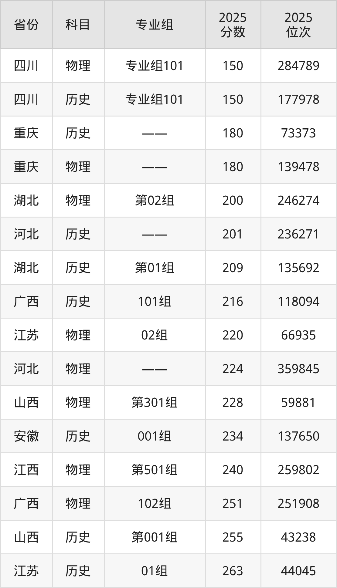 历史类:2025年湖南外国语职业学院录取最低分是150分(四川),对应的位次排名是177978名。