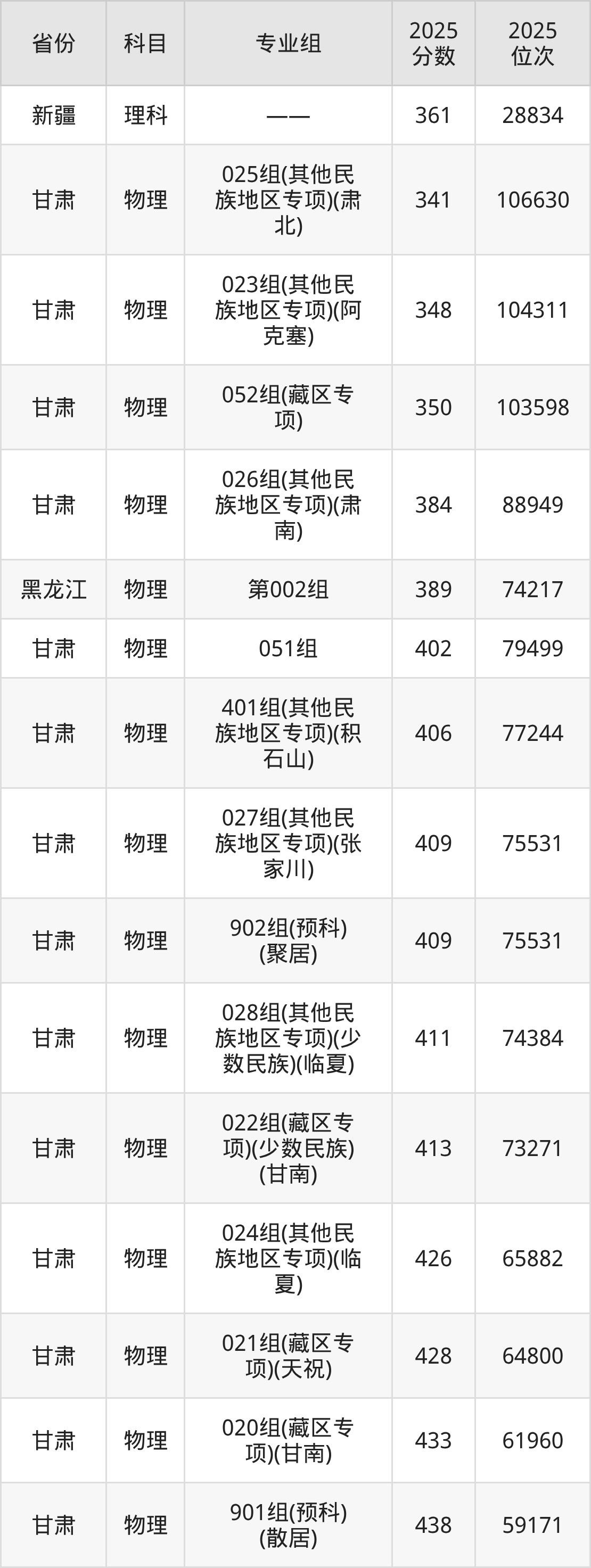 理科:2025年甘肃医学院录取最低分是361分(新疆),对应的位次排名是28834名。