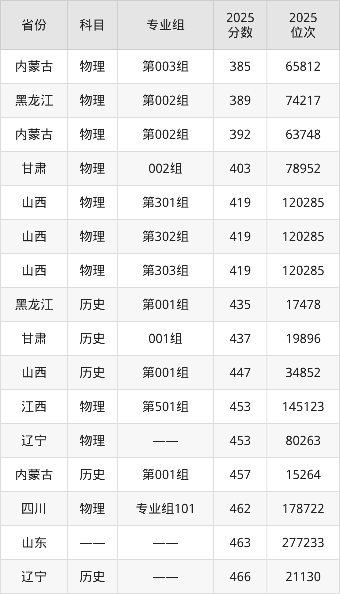 3+3地区:2025年山西工商学院录取最低分是463分(山东),对应的位次排名是277233名。