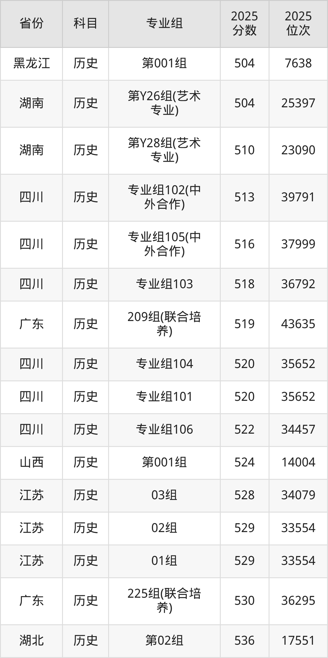 历史类:2025年四川音乐学院省内录取最低分是513分,对应的位次排名是39791名。建议:如果2026年排名超过39791名,那么被该校录取的概率较大。