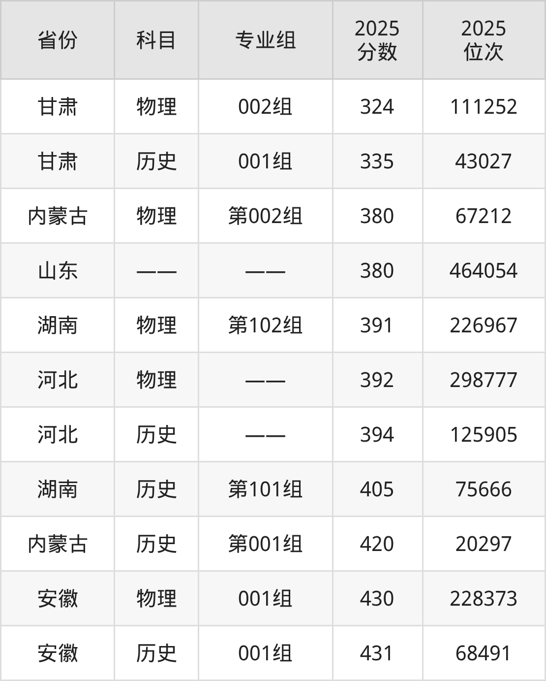 物理类:2025年河南农业职业学院录取最低分是324分(甘肃),对应的位次排名是111252名。