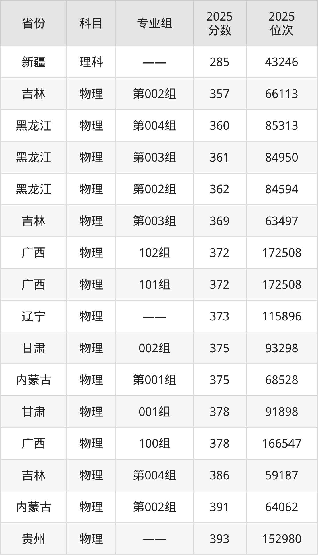物理类:2025年齐齐哈尔工程学院录取最低分是357分(吉林),对应的位次排名是66113名。