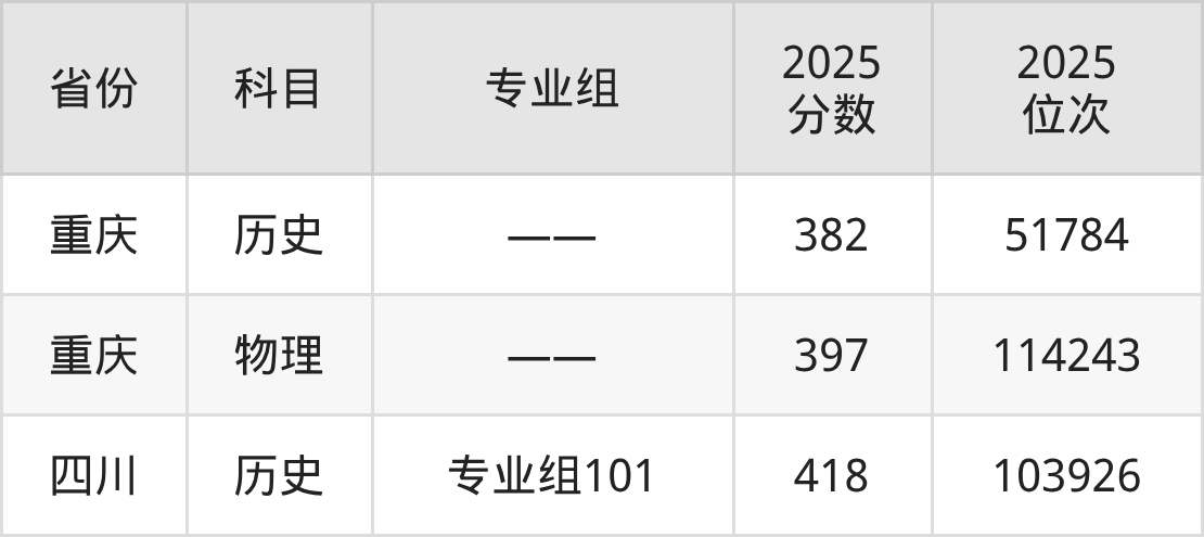历史类:2025年重庆文化艺术职业学院录取最低分是418分(四川),对应的位次排名是103926名。
