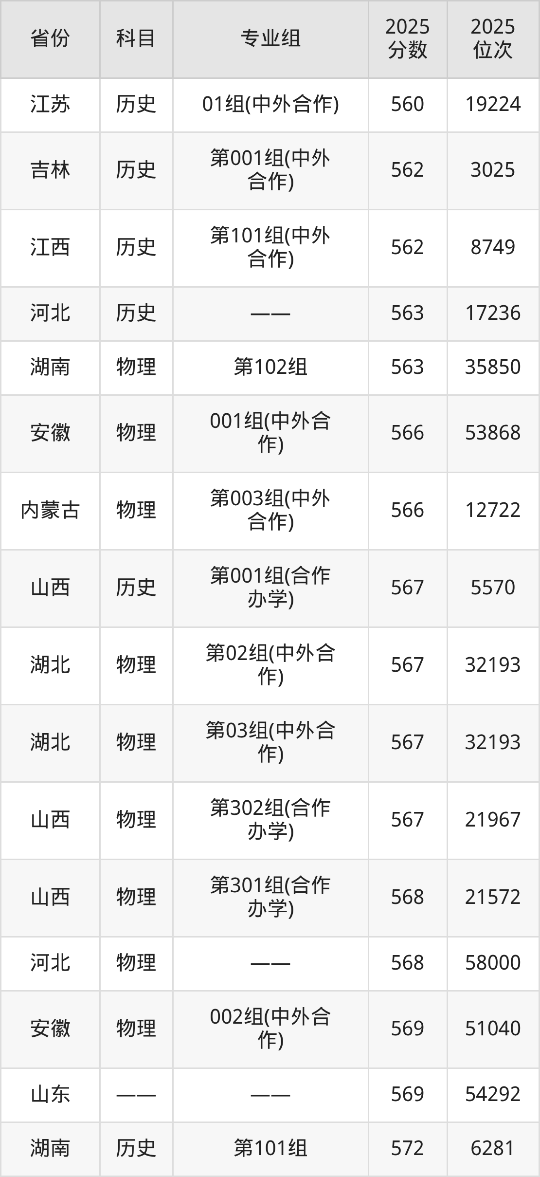 历史类:2025年西交利物浦大学省内录取最低分是560分,对应的位次排名是19224名。建议:如果2026年排名超过19224名,那么被该校录取的概率较大。