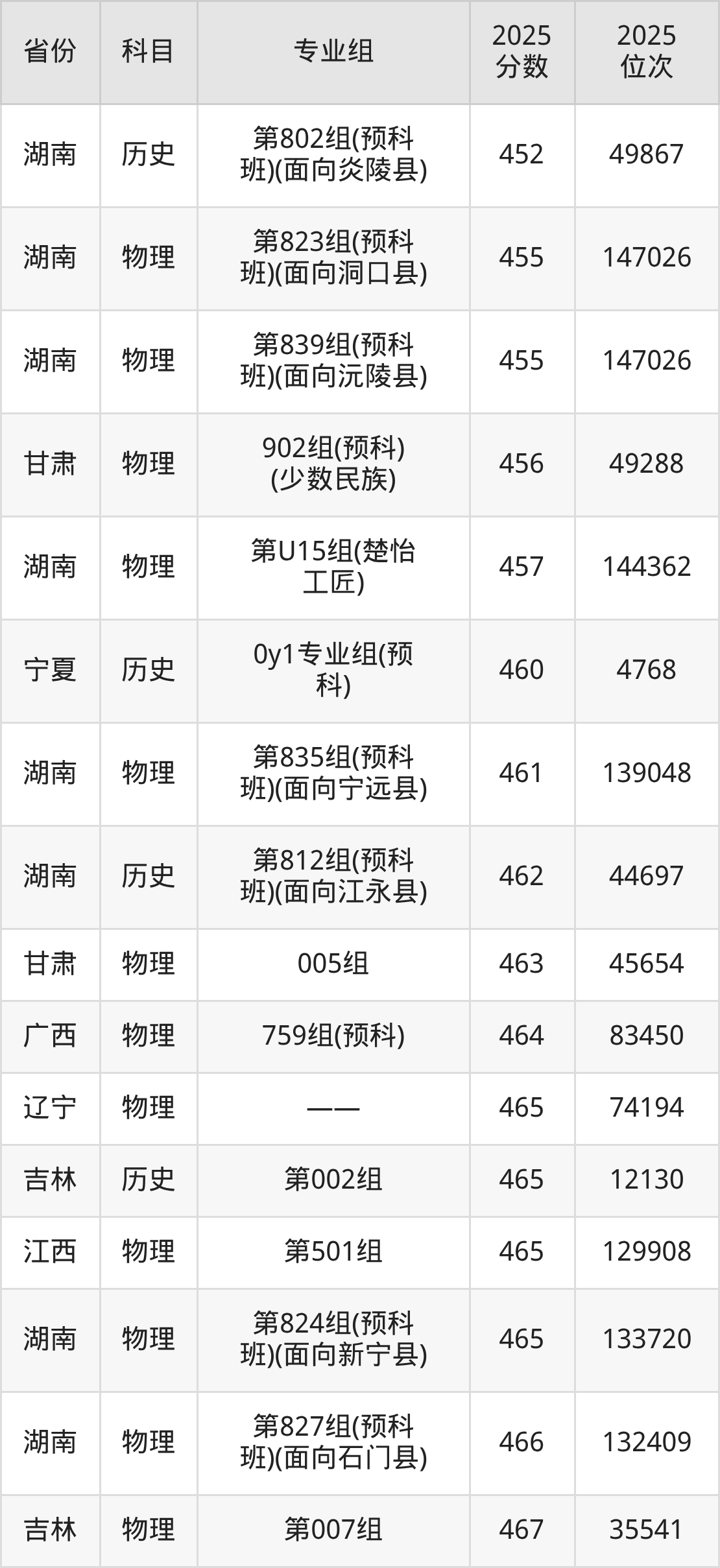 历史类:2025年吉首大学省内录取最低分是452分,对应的位次排名是49867名。建议:如果2026年排名超过49867名,那么被该校录取的概率较大。