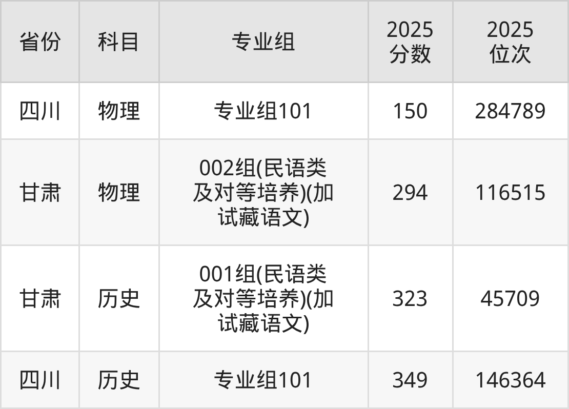 历史类:2025年甘孜职业学院录取最低分是323分(甘肃),对应的位次排名是45709名。