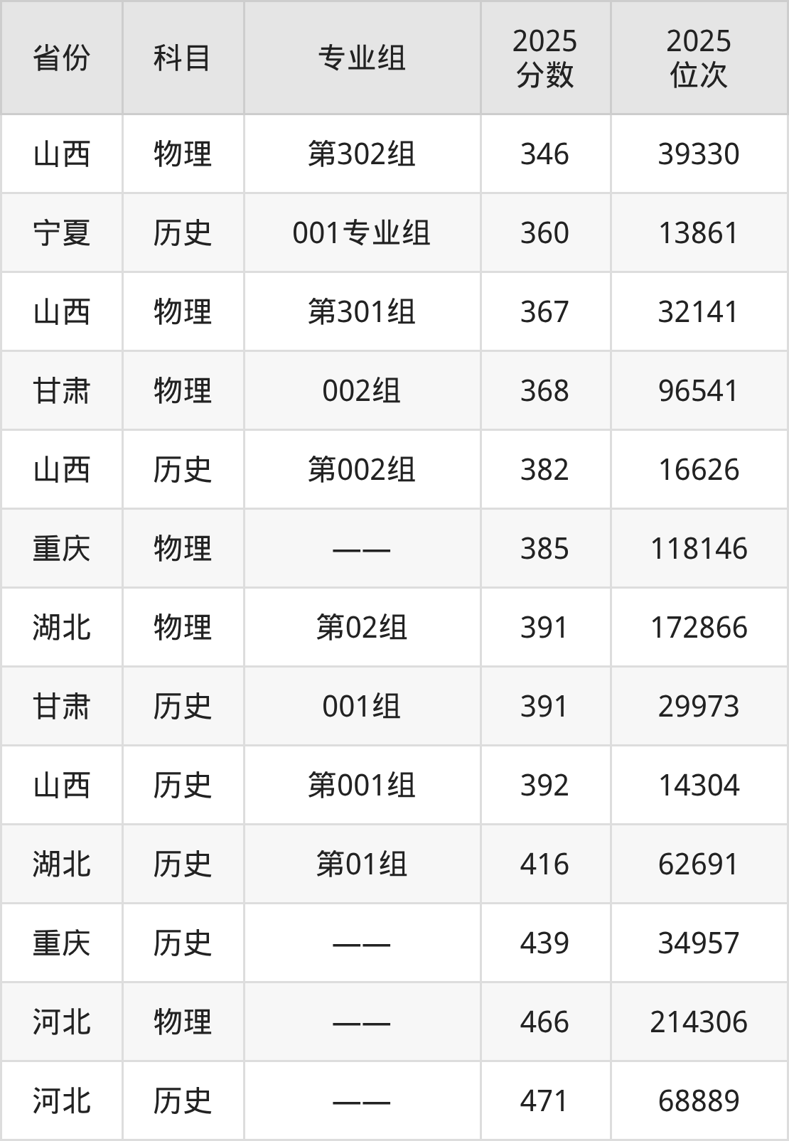 物理类:2025年山西卫生健康职业学院录取最低分是368分(甘肃),对应的位次排名是96541名。