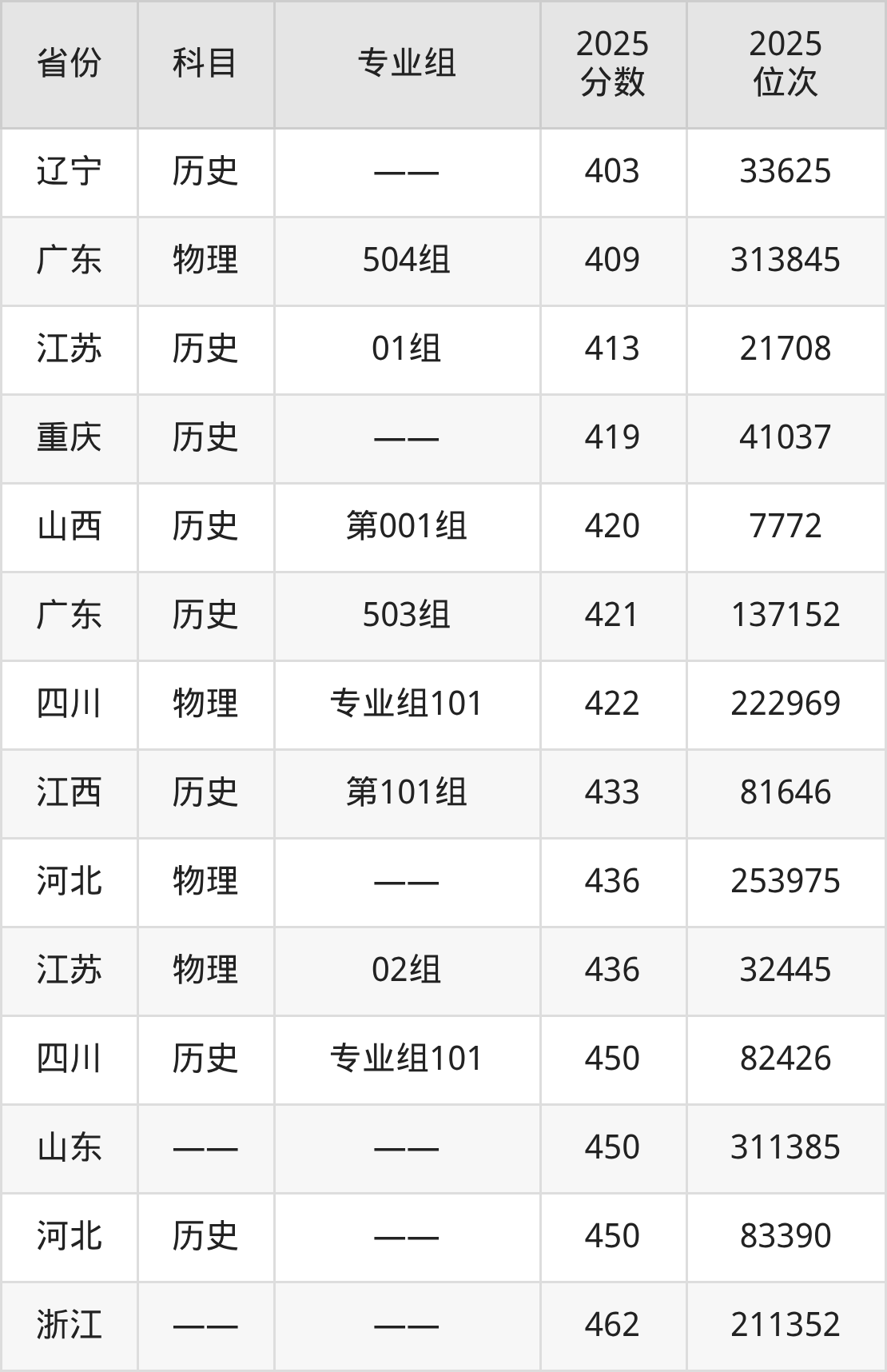 3+3地区:2025年四川水利职业技术学院录取最低分是450分(山东),对应的位次排名是311385名。