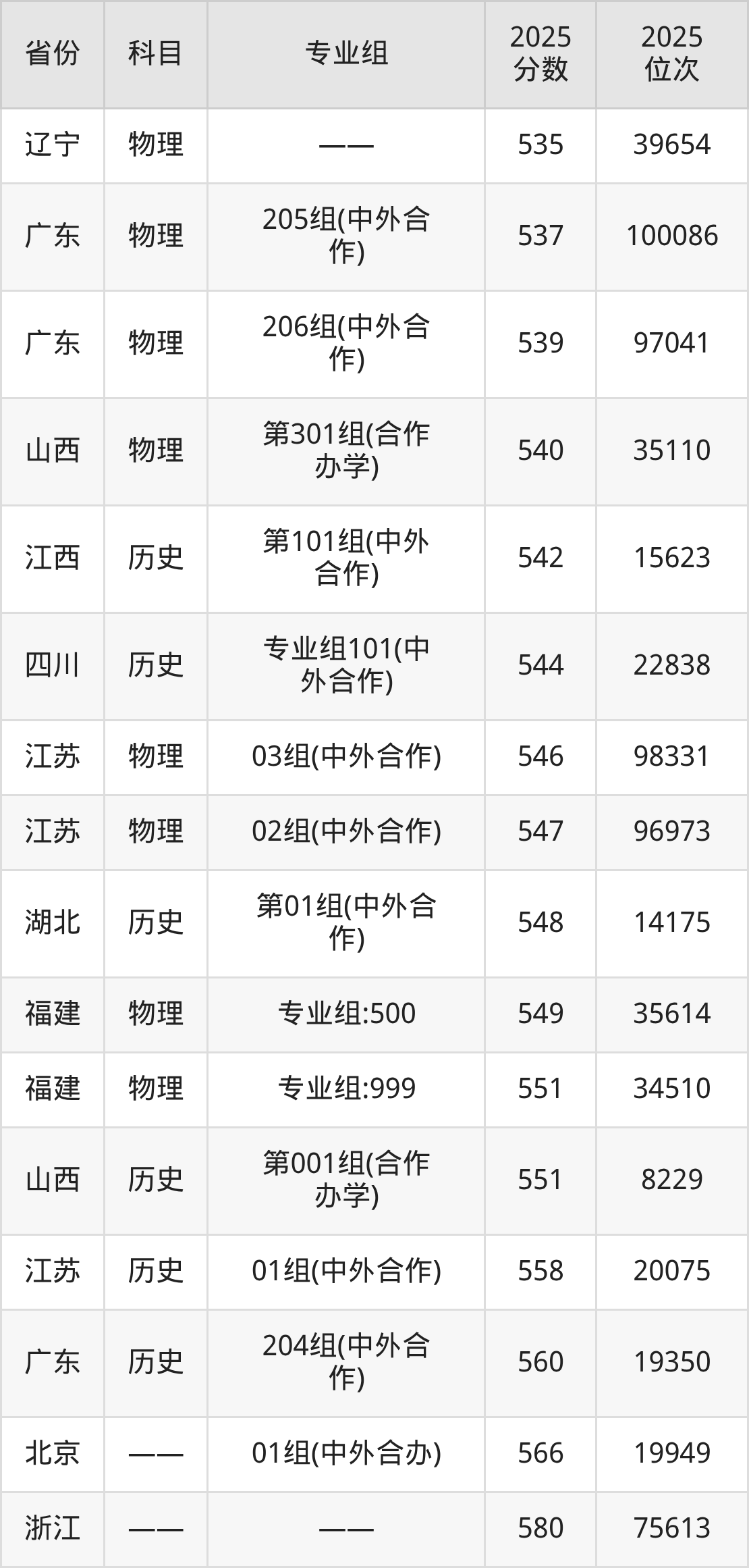 2025年温州肯恩大学省内录取最低分是580分,对应的位次排名是75613名。建议:如果2026年排名超过75613名,那么被该校录取的概率较大。