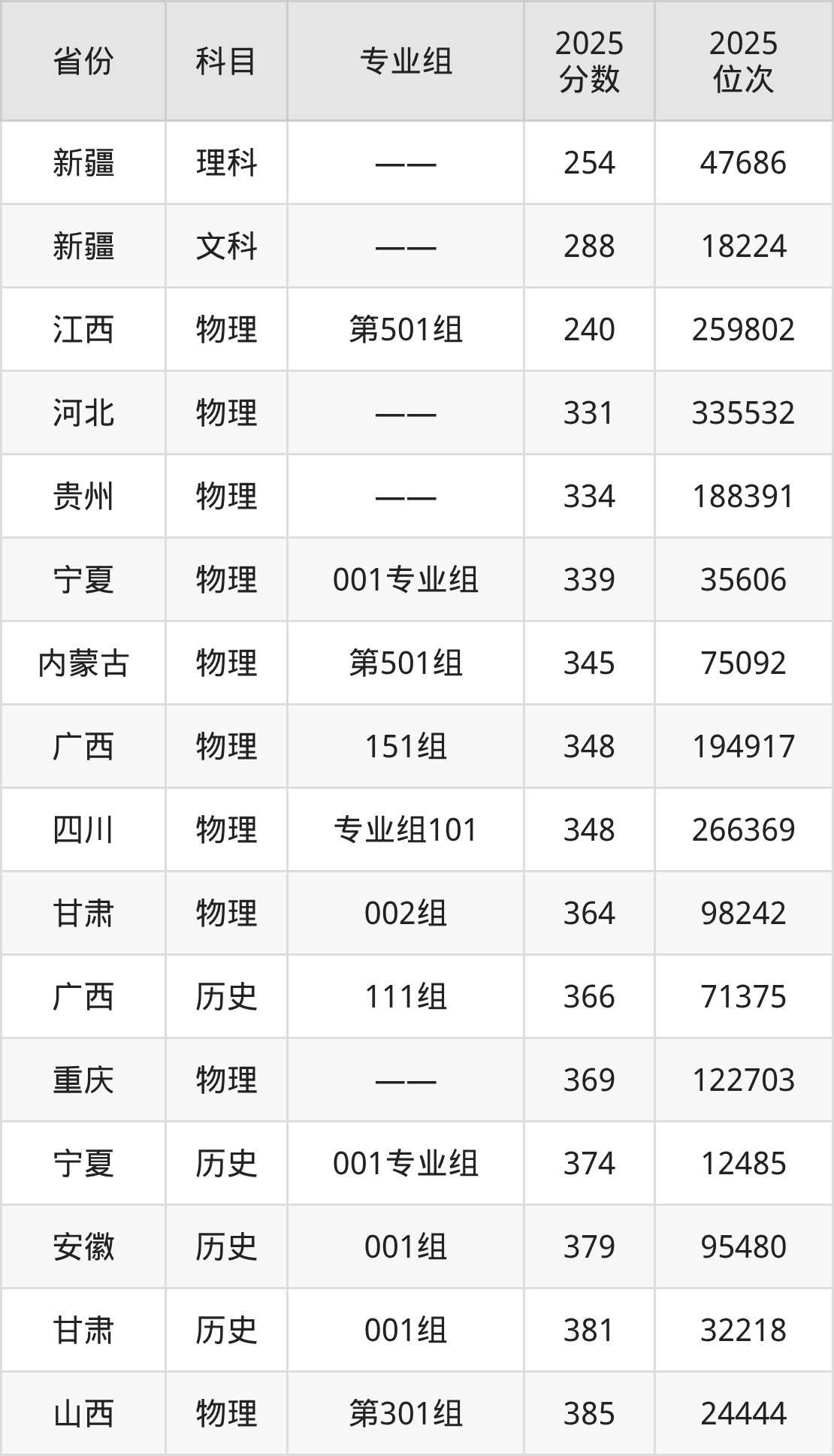 物理类:2025年宝鸡职业技术学院录取最低分是240分(江西),对应的位次排名是259802名。