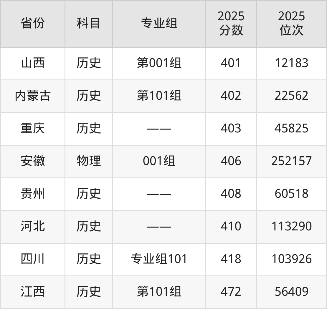 历史类:2025年宝鸡职业技术学院录取最低分是366分(广西),对应的位次排名是71375名。