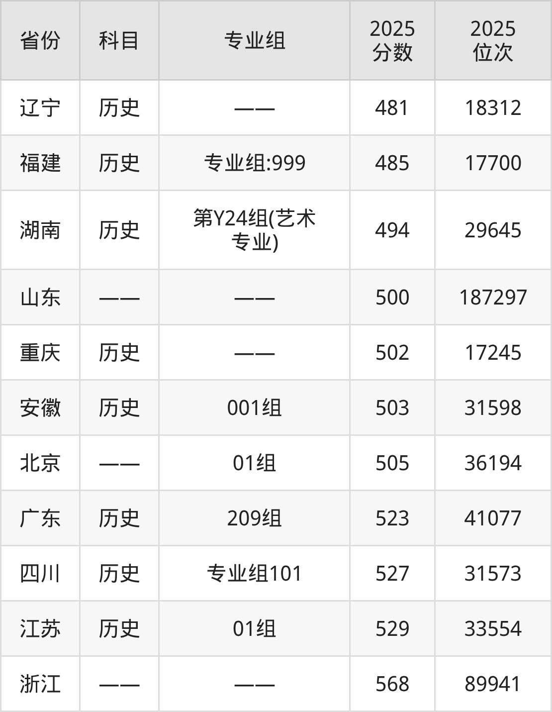 历史类:2025年山东艺术学院录取最低分是481分(辽宁),对应的位次排名是18312名。
