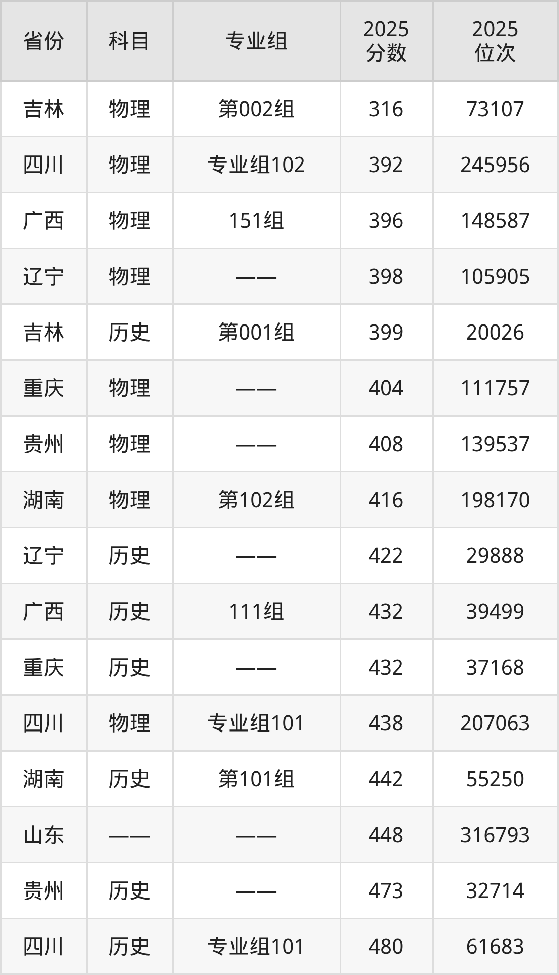 物理类:2025年丽江师范学院录取最低分是316分(吉林),对应的位次排名是73107名。