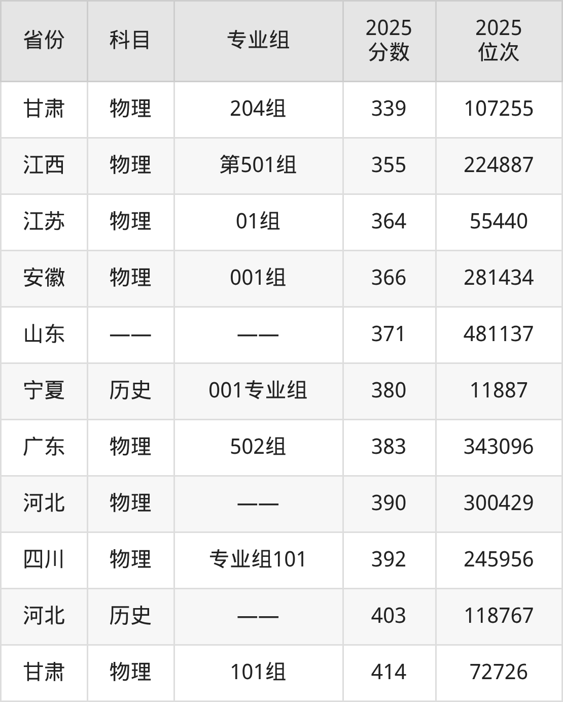 3+3地区:2025年甘肃工业职业技术大学录取最低分是371分(山东),对应的位次排名是481137名。