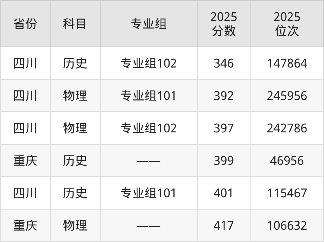 物理类:2025年四川机电职业技术学院录取最低分是417分(重庆),对应的位次排名是106632名。