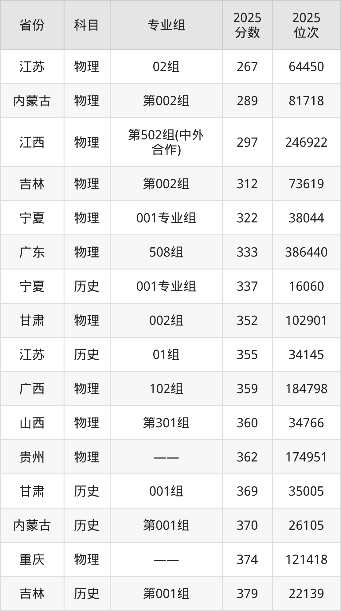 历史类:2025年江西交通职业技术学院录取最低分是337分(宁夏),对应的位次排名是16060名。